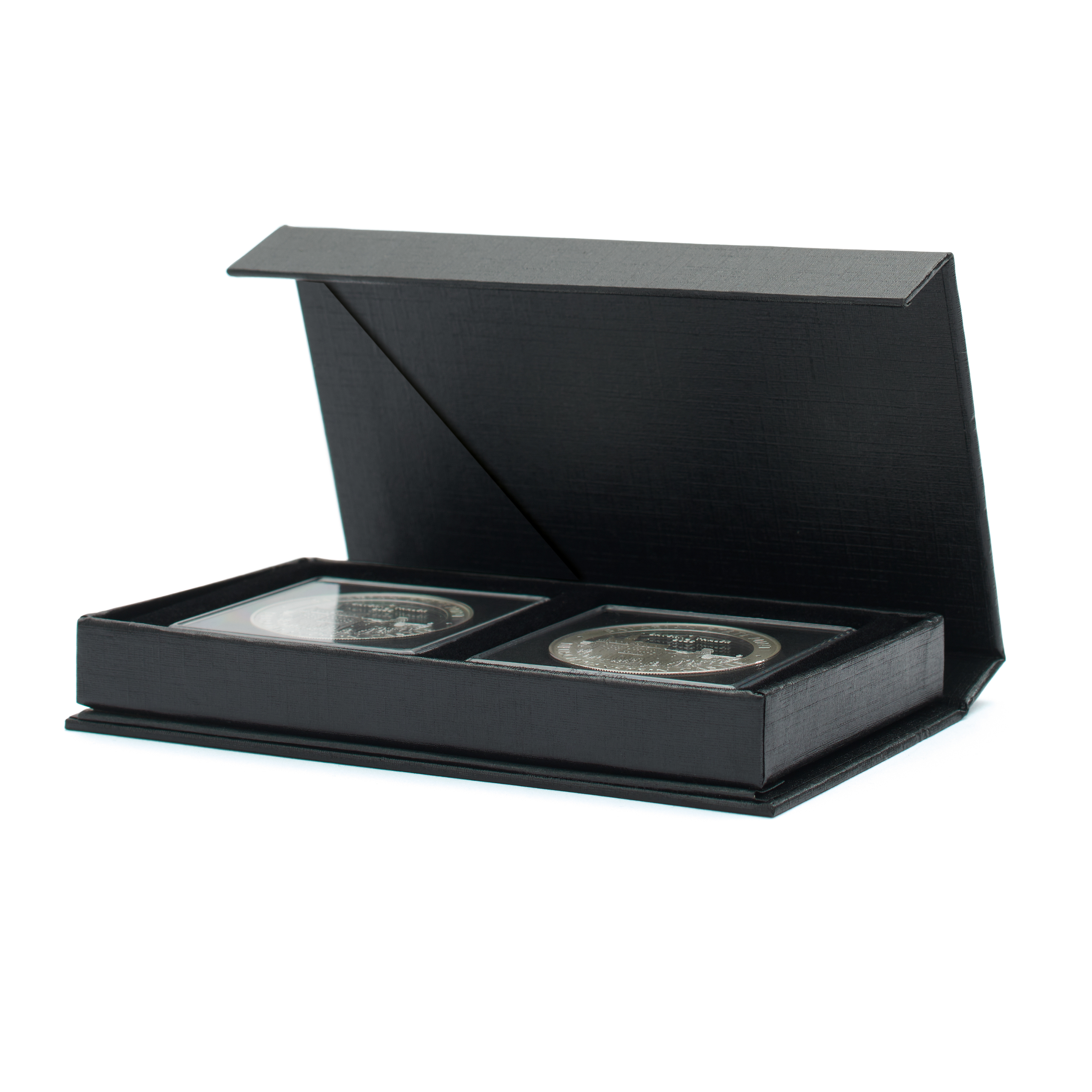 Schwarzes Münzetui aus stabilem Karton für QUADRUM-Kapseln. Der Clou: Mit Aufstellfunktion zur Präsentation der Münzen. Einlage mit schwarzer, veloursartiger Oberfläche. Unauffälliger Magnetverschluss. Kapseln nicht im Lieferumfang enthalten.