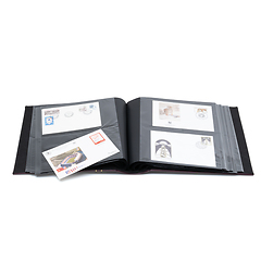 Für 200 Ersttagsbriefe (First-Day-Cover), Postkarten und Ganzsachen. Mit 50 doppelseitigen, klarsichtigen, weichmacherfreien Hüllen und eingearbeiteten schwarzem Trennfolien, mit dem Rücken verbunden. Nutzbares Innenformat: 195 x 130 mm. Mit passender Schutzkassette. Außenformat: 280 x 290 x 86 mm