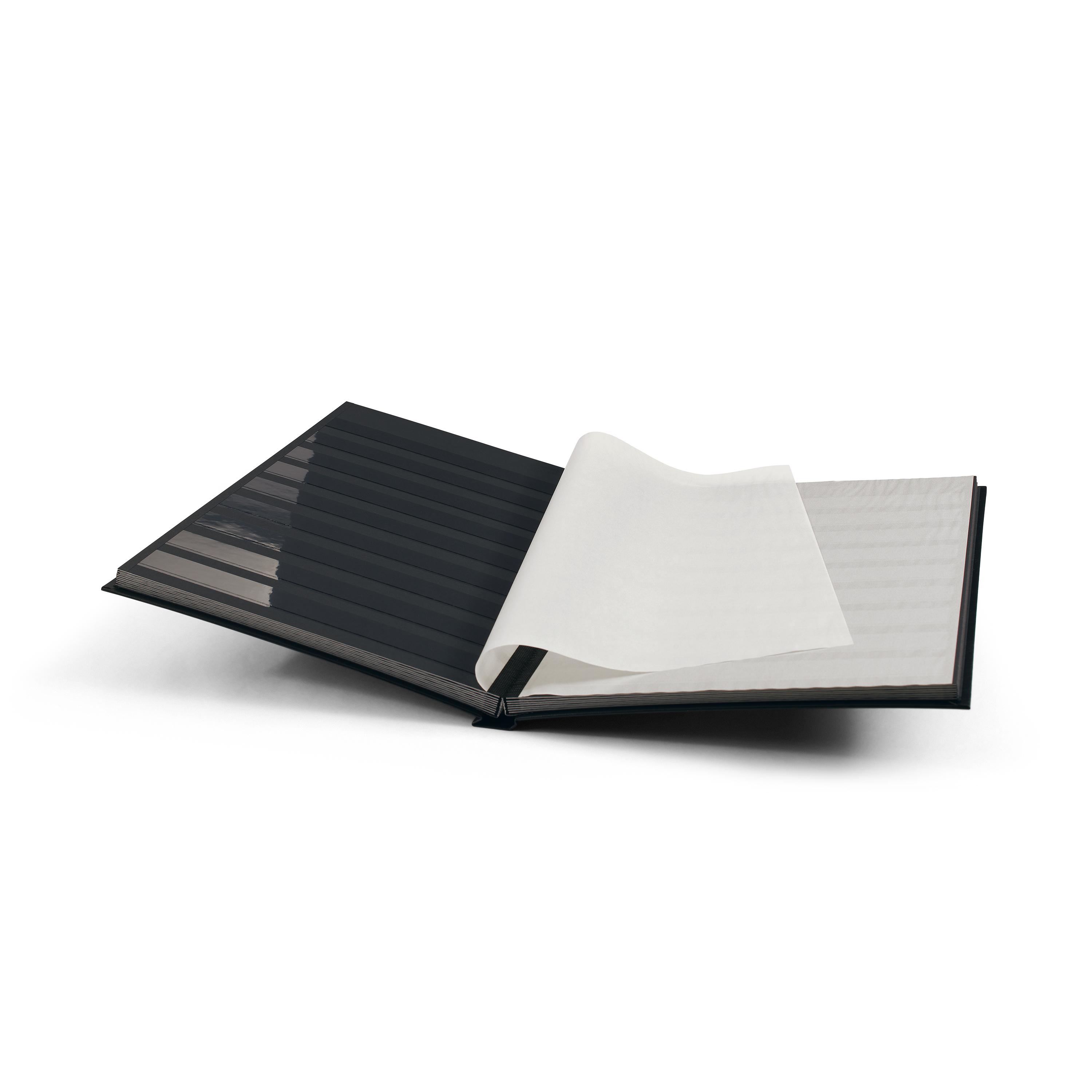 BASIC Einsteckbuch A4*, 32 schwarze Seiten, unwattierter Einband, 9 Klarsichstreifen pro Seite, Zwischenblätter doppelt, starre Bindung.