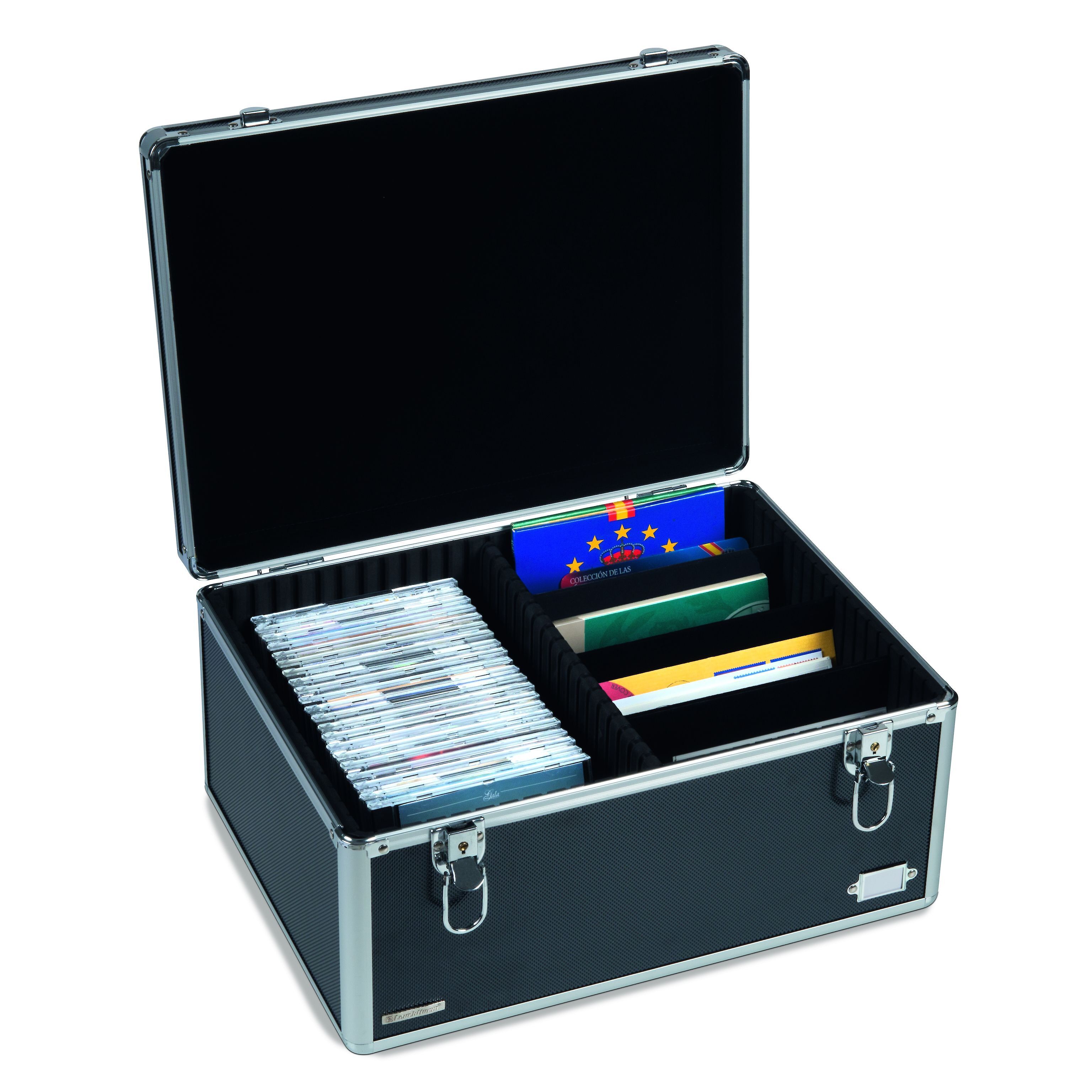 Sammelkoffer zur komfortablen und sicheren Aufbewahrung von Münzsätzen, CD’s, Einsteckkarten, Postkarten, Banknotenhüllen etc. Die flexible Inneneinteilung bietet Platz für Sammelobjekte bis zu einer Höhe von 168 mm und einer Breite von 370 mm. Fassungsvermögen: 1.500 Postkarten, 65 CD-Hüllen breit (Jewelcase), 130 CD-Hüllen schmal (Slimcase). Außenformat: 400 x 225 x 315 mm.