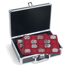div. Tableaus = Ausgestattet mit 2 Tableaus für je 24 Münzen bis zu einem Durchmesser von 33 mm., 2 Tableaus für je 20 Münzen bis zu einem Durchmesser von 41 mm und 2 Tableaus für je 12 Münzen bis zu einem Durchmesser von 48 mm.