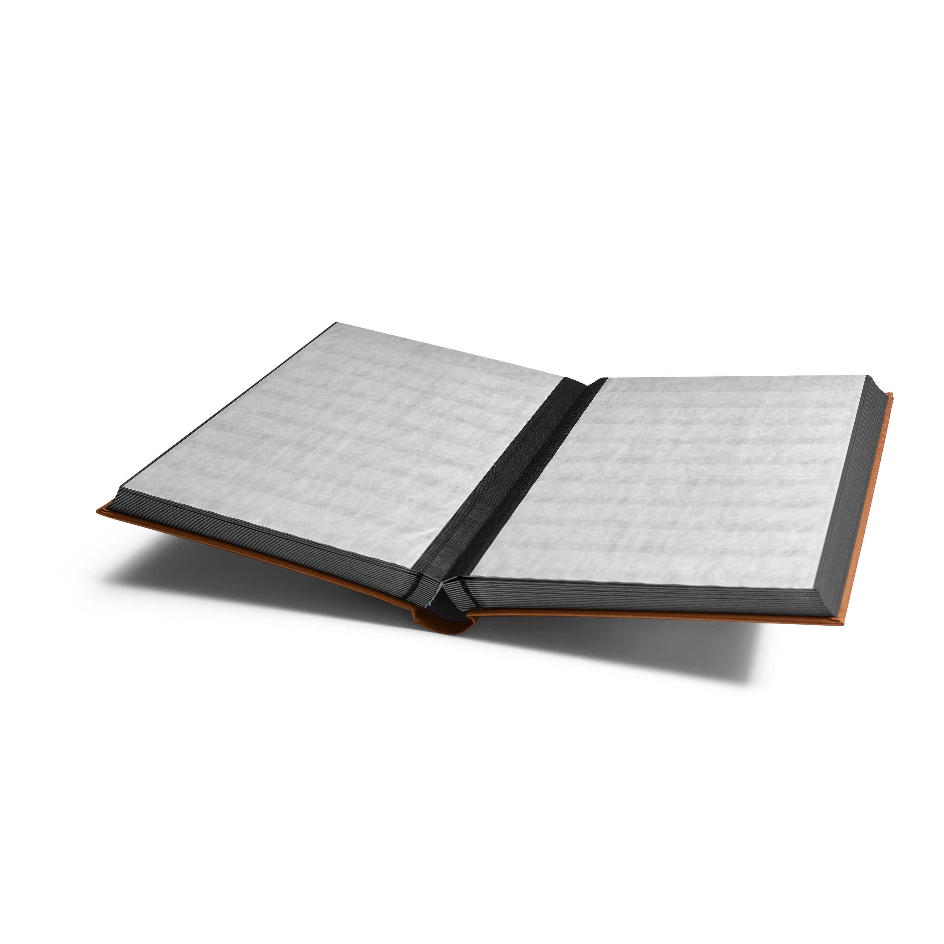 Einsteckbuch A4, 64 schwarze Seiten, wattierter Einband in Metallic-Optik, mit silber- oder goldfarbener Prägung, 9 Klarsichtstreifen pro Seite, doppelte Pergamin-Zwischenblätter, Doppel-Gelenk-Bindung.