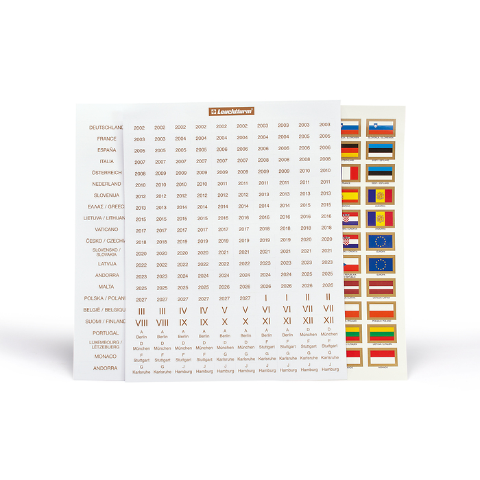 Die Etiketten für Euro-Münzen sind ein unverzichtbares Zubehör für jede Münzsammlung. Jedes Set enthält drei selbstklebende Flaggen-Sets, die speziell für Euro-Münzblätter konzipiert sind. Mit einer Blattgröße von 240 x 190 mm sind sie kompakt und ermöglichen eine klare und ordentliche Beschriftung. Die goldenen Schriftzüge umfassen die Namen der Deutschen Prägestätten, Band- und Jahreszahlen von 2002 bis 2027 sowie Flaggensätze der 25 Euro-Länder, einschließlich San Marino, Vatikan, Monaco, Andorra und zwei Europa-Flaggen, einschließlich Kroatien.