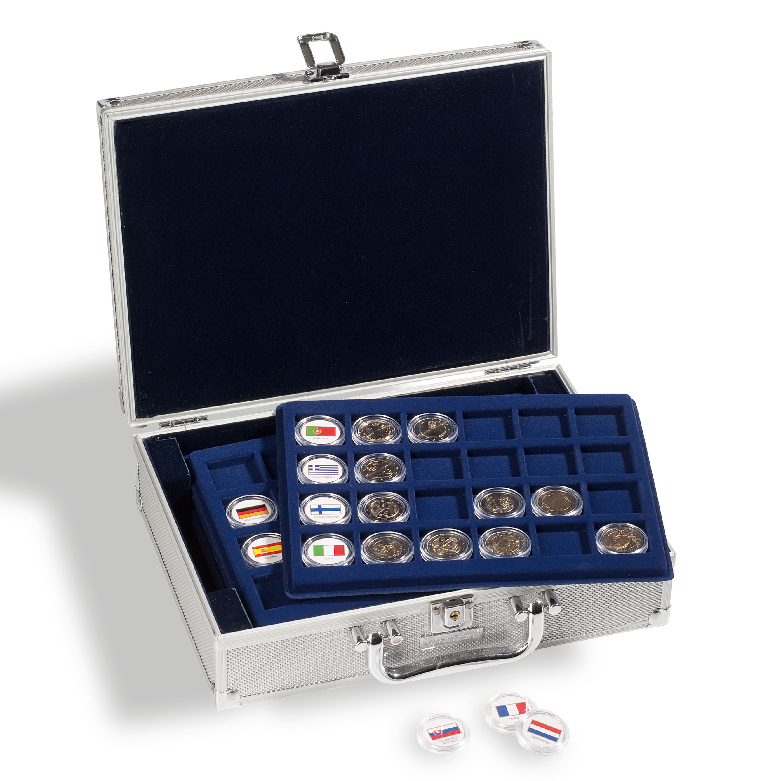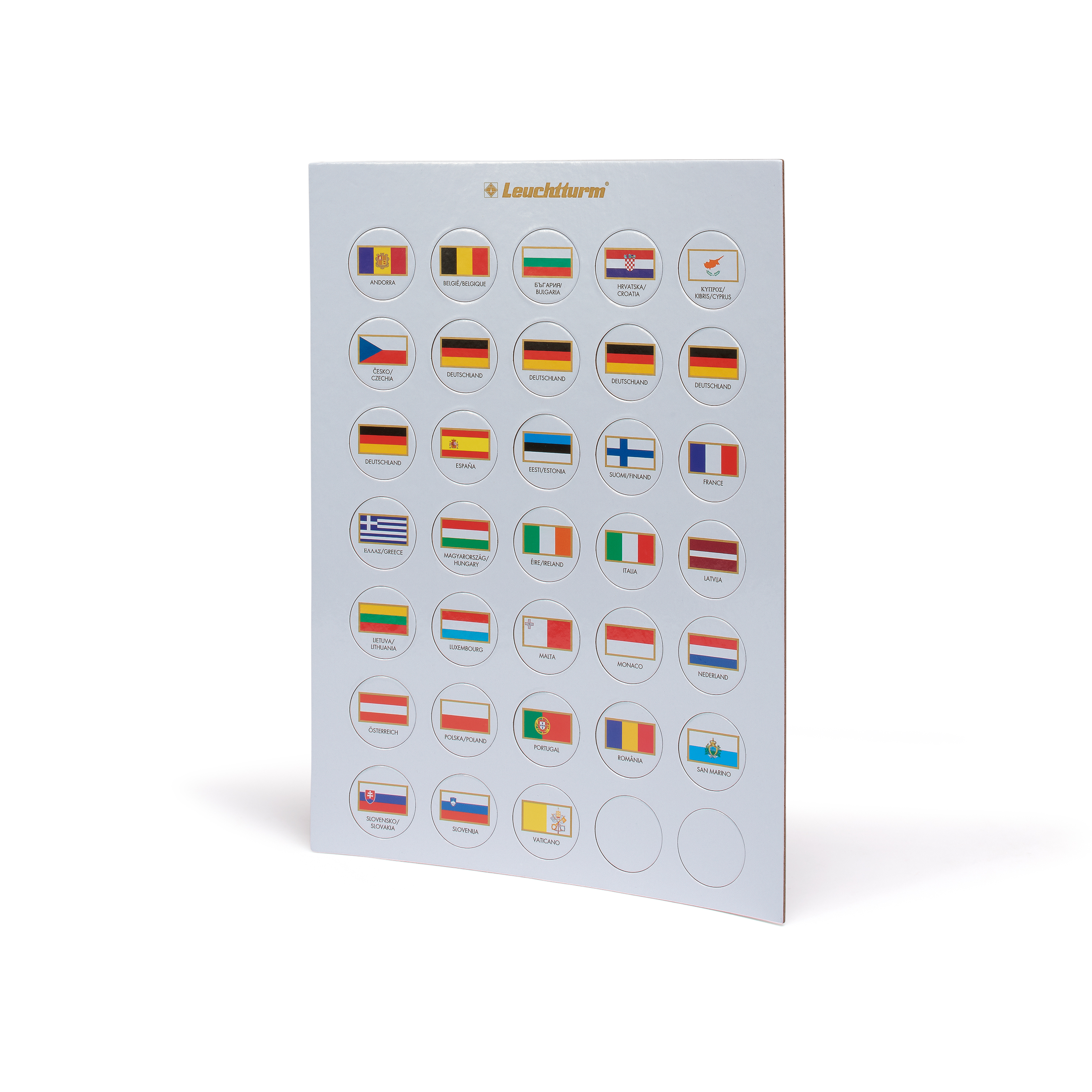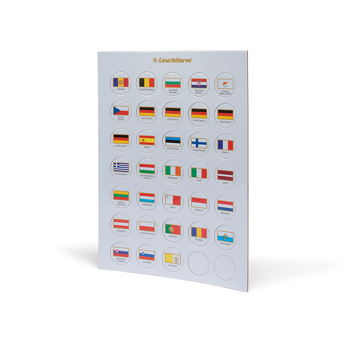 Flaggen-Chips aus Karton zur Kennzeichnung und Gliederung von 2-Euro-Münzsammlungen. Flaggen-Satz 29 Flaggen inkl. San Marino, Vatikan, Monaco, Andorra und inkl. 5 deutscher Flaggen zur Berücksichtigung verschiedener Prägestätten, 4 neutrale Chips zur individuellen Gestaltung. Die Flaggen-Chips haben einen Durchmesser von 26 mm und passen damit hervorragend in alle Aufbewahrungssysteme für 2-Euro-Münzen wie z.B. Alben, Tableaus, Kapseln, Münzboxen, etc.