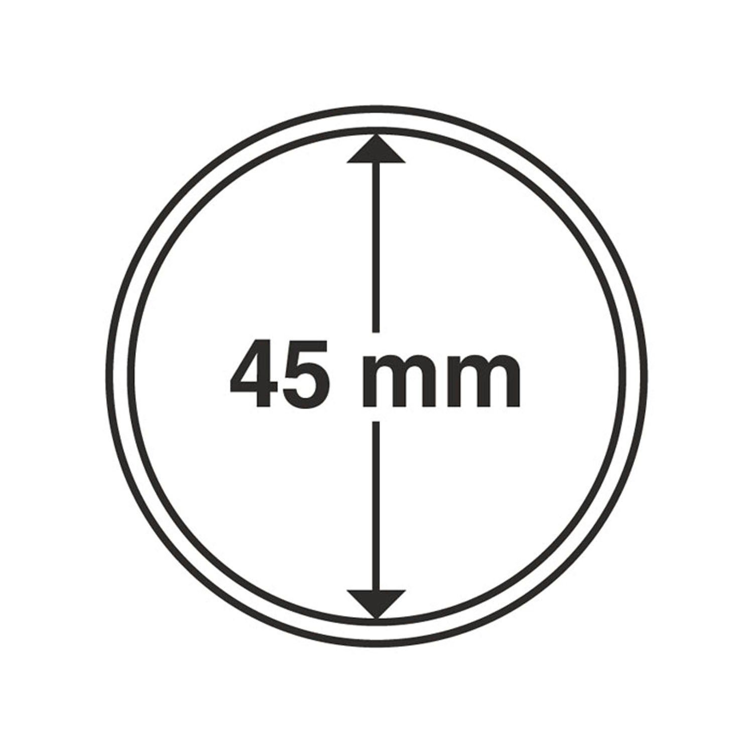 Original Münzkapseln von Leuchtturm - der optimale Schutz für Ihre Münzen. Gefertigt aus hochwertigem, kratzfestem Kunststoff. Farbe: Glasklar. Die Kapseln lassen sich aufgrund des Außenrandes leicht öffnen und verfügen dennoch über einen sicheren Verschluß. Innendurchmesser: 45 mm Außendurchmesser 51 mm. Innenhöhe: ca. 4,2 mm