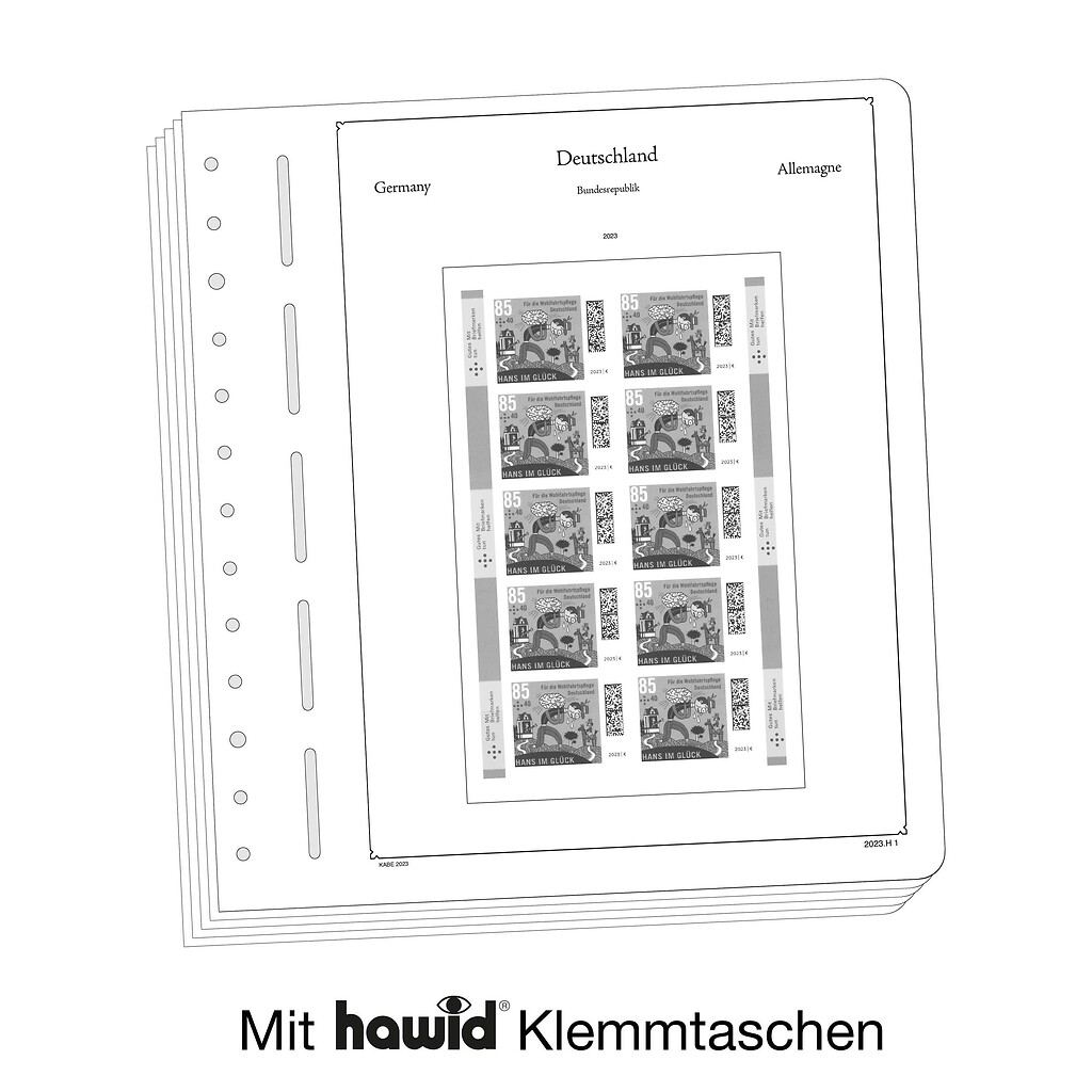KABE Vordruckblätter (Format 275 x 310 mm) werden im detailgetreuen schwarz–weiß Offsetdruckauf alterungsbeständigem, holz- und säurefreiem Karton (175 g/m 2 ) gedruckt. Wir verzichten bewusst auf einen Farbdruck. Dies dient als Orientierungshilfe, damit Sie auf einen Blick sehen, welche Marken Ihnen noch fehlen. In der Größe des Markenvordrucks sind SF-Schutztaschen aus weichmacherfreier, glasklarer, entspiegelter Polystyrol-Folie auf den Albenkarton geklebt. Die Schutztaschen halten die Briefmarken präzise an ihrem Platz und verhindern ein Festkleben. Gleichzeitig bieten sie auch einen optimalen Schutz gegen Staub und Beschädigungen. Das doppelte Leinengelenk sorgt für eine optimale Planlage sowie eine lange Haltbarkeit für Ihre Vordruckblätter.