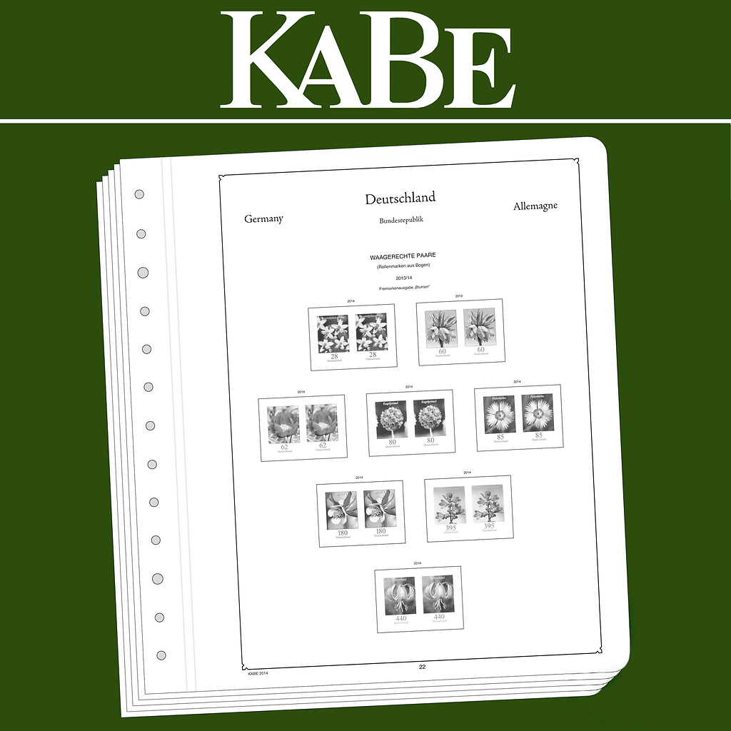 KABE Vordruckblätter (Format 275 x 310 mm) werden im detailgetreuen schwarz–weiß Offsetdruckauf alterungsbeständigem, holz- und säurefreiem Karton (175 g/m 2 ) gedruckt. Wir verzichten bewusst auf einen Farbdruck. Dies dient als Orientierungshilfe, damit Sie auf einen Blick sehen, welche Marken Ihnen noch fehlen. In der Größe des Markenvordrucks sind SF-Schutztaschen aus weichmacherfreier, glasklarer, entspiegelter Polystyrol-Folie auf den Albenkarton geklebt. Die Schutztaschen halten die Briefmarken präzise an ihrem Platz und verhindern ein Festkleben. Gleichzeitig bieten sie auch einen optimalen Schutz gegen Staub und Beschädigungen. Das doppelte Leinengelenk sorgt für eine optimale Planlage sowie eine lange Haltbarkeit für Ihre Vordruckblätter.