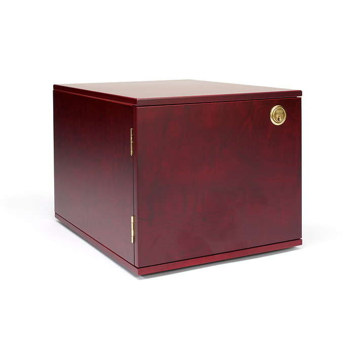 Hochwertiges, mahagonifarbenes Kabinett für bis zu 10 Münzboxen MB bzw. 6 Münzboxen XL. Durch die edle Optik auch ideal als Möbelstück zu platzieren. Mit hellem Filz ausgekleidet, abschließbar (2 Schlüssel). Außenformat: 260 x 230 x 343 mm. Hinweis: Münzboxen sind nicht im Lieferumfang enthalten
