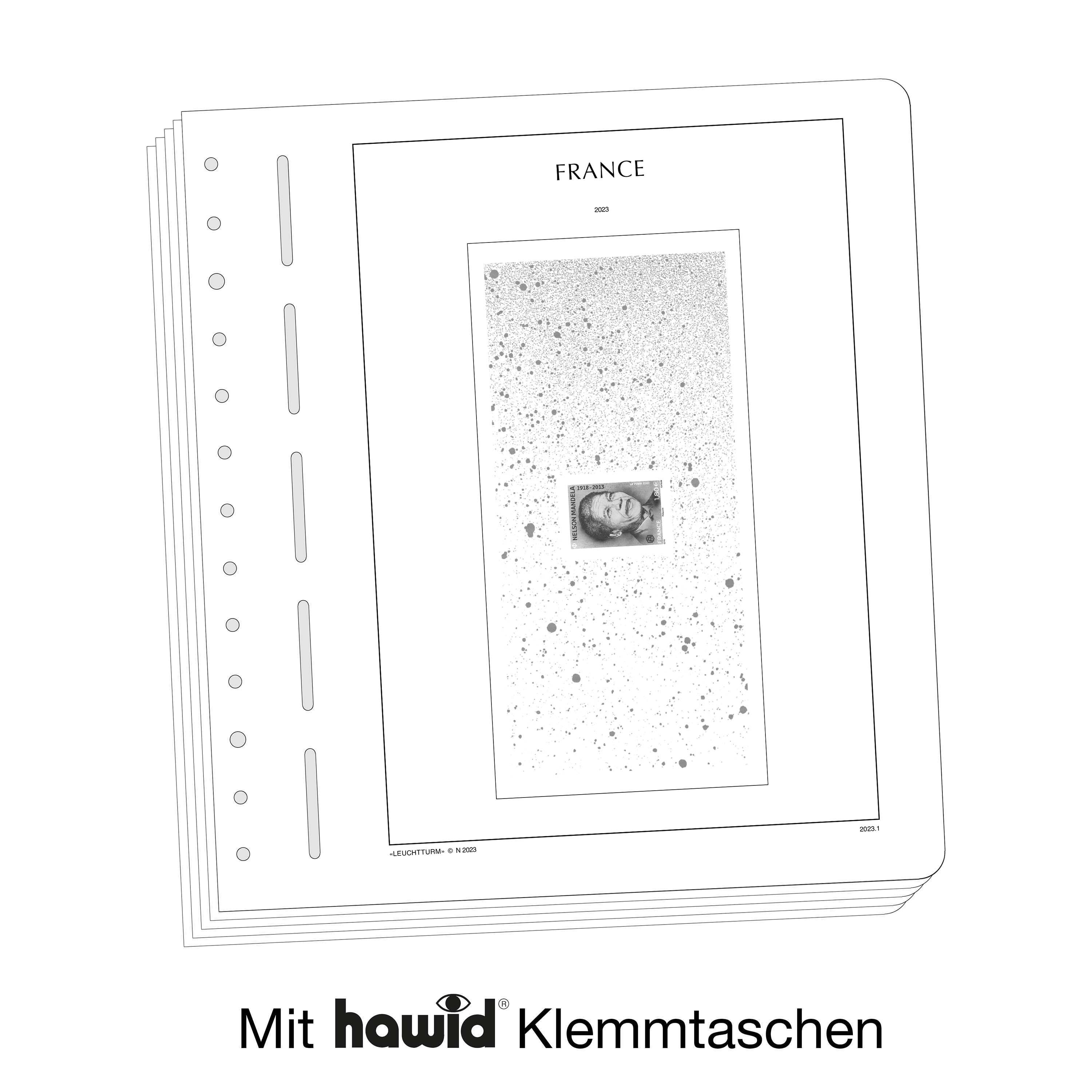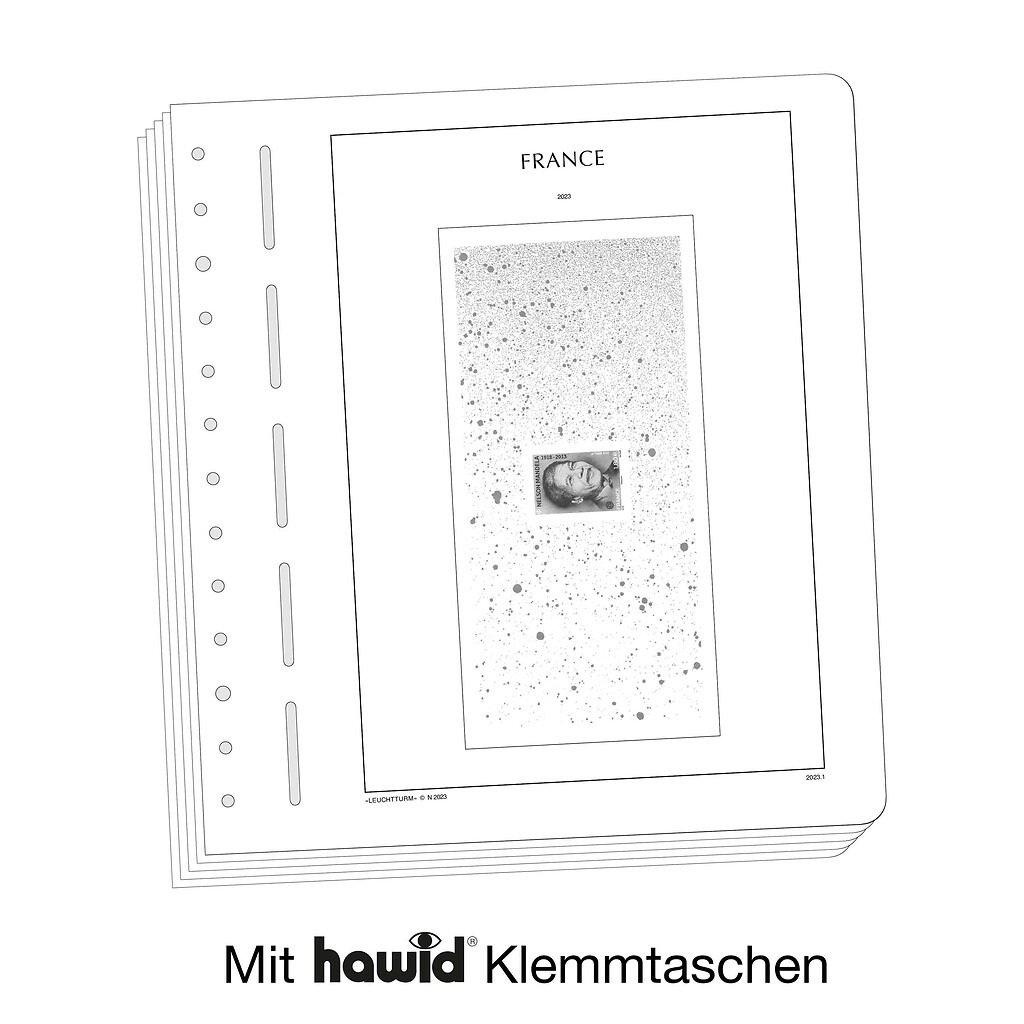 LEUCHTTURM Albenblätter (Format 270 x 297 mm/ 13-Loch-System) werden im detailgetreuen schwarz–weiß Offsetdruckauf alterungsbeständigem, holz- und säurefreiem Karton (170 g/m 2 ) gedruckt. Wir verzichten bewusst auf einen Farbdruck. Dies dient als Orientierungshilfe, damit Sie auf einen Blick sehen, welche Marken Ihnen noch fehlen. In der Größe des Markenvordrucks sind SF-Schutztaschen aus weichmacherfreier, glasklarer, entspiegelter Polystyrol-Folie auf den Albenkarton geklebt. Die Schutztaschen halten die Briefmarken präzise an ihrem Platz und verhindern ein Festkleben. Gleichzeitig bieten sie auch einen optimalen Schutz gegen Staub und Beschädigungen.