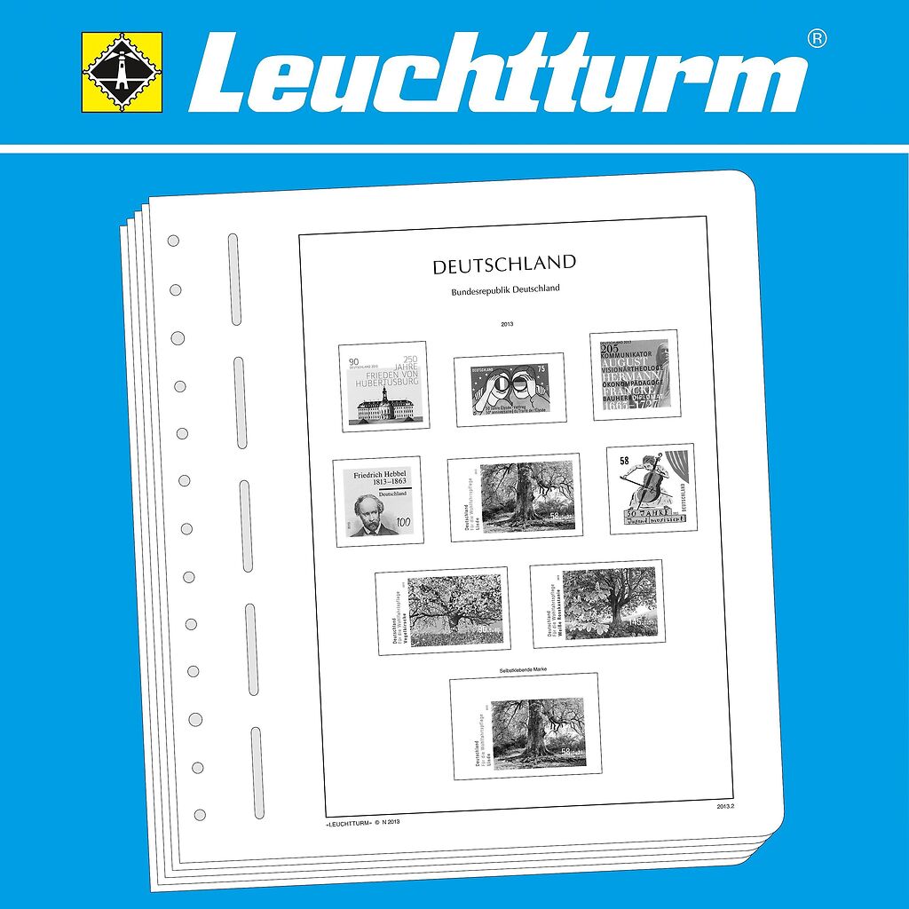 LEUCHTTURM Albenblätter (Format 270 x 297 mm/ 13-Loch-System) werden im detailgetreuen schwarz–weiß Offsetdruckauf alterungsbeständigem, holz- und säurefreiem Karton (170 g/m 2 ) gedruckt. Wir verzichten bewusst auf einen Farbdruck. Dies dient als Orientierungshilfe, damit Sie auf einen Blick sehen, welche Marken Ihnen noch fehlen. In der Größe des Markenvordrucks sind SF-Schutztaschen aus weichmacherfreier, glasklarer, entspiegelter Polystyrol-Folie auf den Albenkarton geklebt. Die Schutztaschen halten die Briefmarken präzise an ihrem Platz und verhindern ein Festkleben. Gleichzeitig bieten sie auch einen optimalen Schutz gegen Staub und Beschädigungen.
