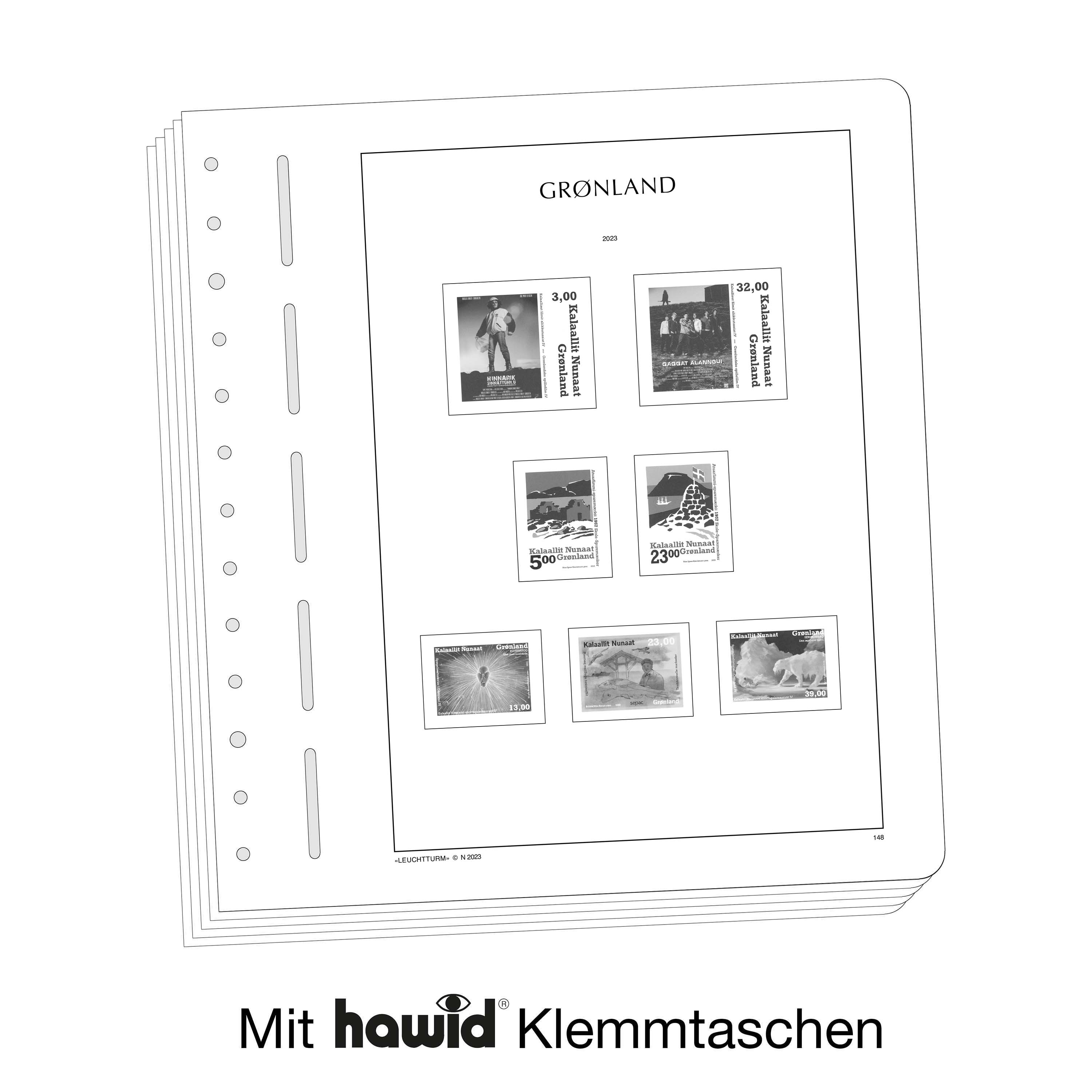 LEUCHTTURM Albenblätter (Format 270 x 297 mm/ 13-Loch-System) werden im detailgetreuen schwarz–weiß Offsetdruckauf alterungsbeständigem, holz- und säurefreiem Karton (170 g/m 2 ) gedruckt. Wir verzichten bewusst auf einen Farbdruck. Dies dient als Orientierungshilfe, damit Sie auf einen Blick sehen, welche Marken Ihnen noch fehlen. In der Größe des Markenvordrucks sind SF-Schutztaschen aus weichmacherfreier, glasklarer, entspiegelter Polystyrol-Folie auf den Albenkarton geklebt. Die Schutztaschen halten die Briefmarken präzise an ihrem Platz und verhindern ein Festkleben. Gleichzeitig bieten sie auch einen optimalen Schutz gegen Staub und Beschädigungen.