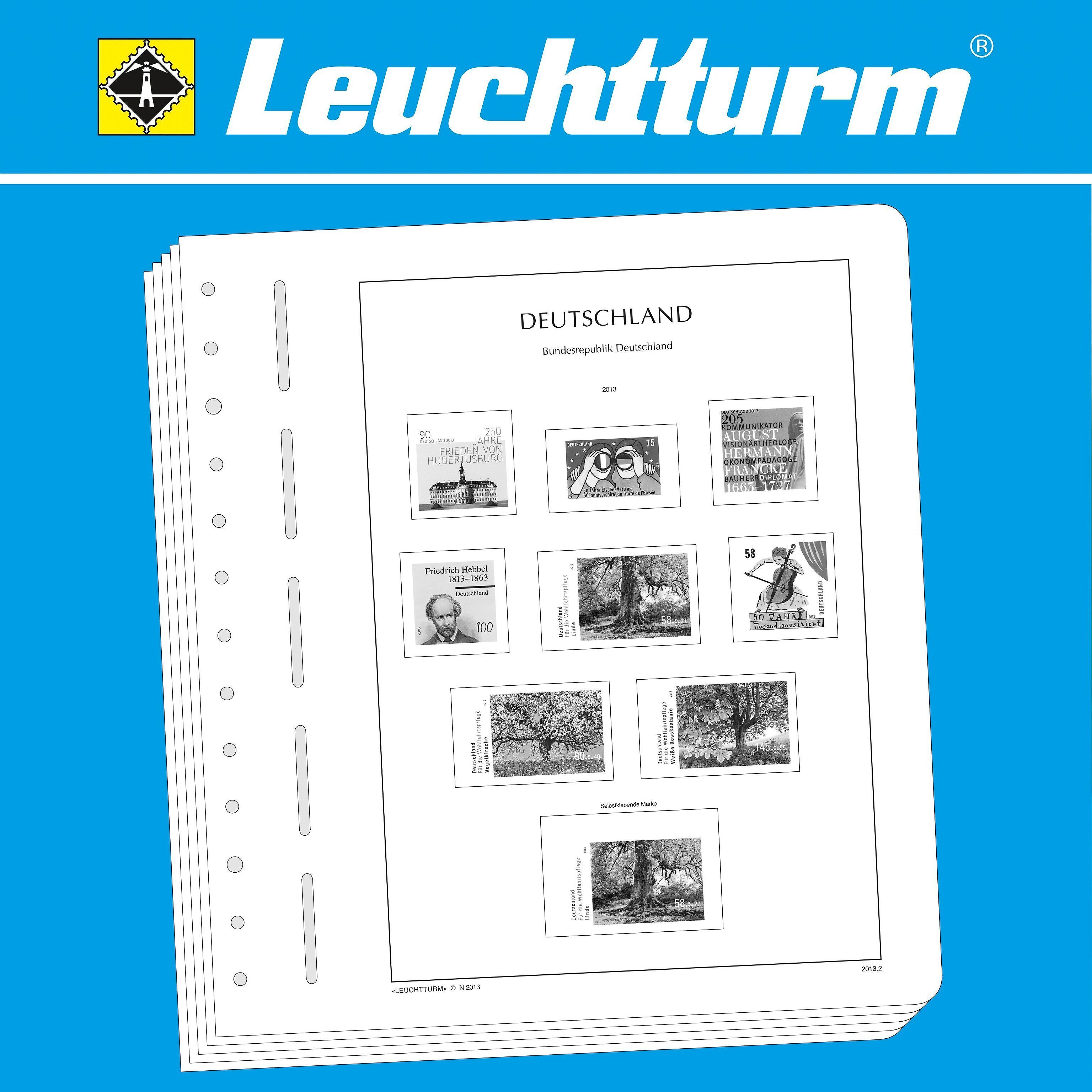 LEUCHTTURM Albenblätter (Format 270 x 297 mm/ 13-Loch-System) werden im detailgetreuen schwarz–weiß Offsetdruckauf alterungsbeständigem, holz- und säurefreiem Karton (170 g/m 2 ) gedruckt. Wir verzichten bewusst auf einen Farbdruck. Dies dient als Orientierungshilfe, damit Sie auf einen Blick sehen, welche Marken Ihnen noch fehlen. In der Größe des Markenvordrucks sind SF-Schutztaschen aus weichmacherfreier, glasklarer, entspiegelter Polystyrol-Folie auf den Albenkarton geklebt. Die Schutztaschen halten die Briefmarken präzise an ihrem Platz und verhindern ein Festkleben. Gleichzeitig bieten sie auch einen optimalen Schutz gegen Staub und Beschädigungen.