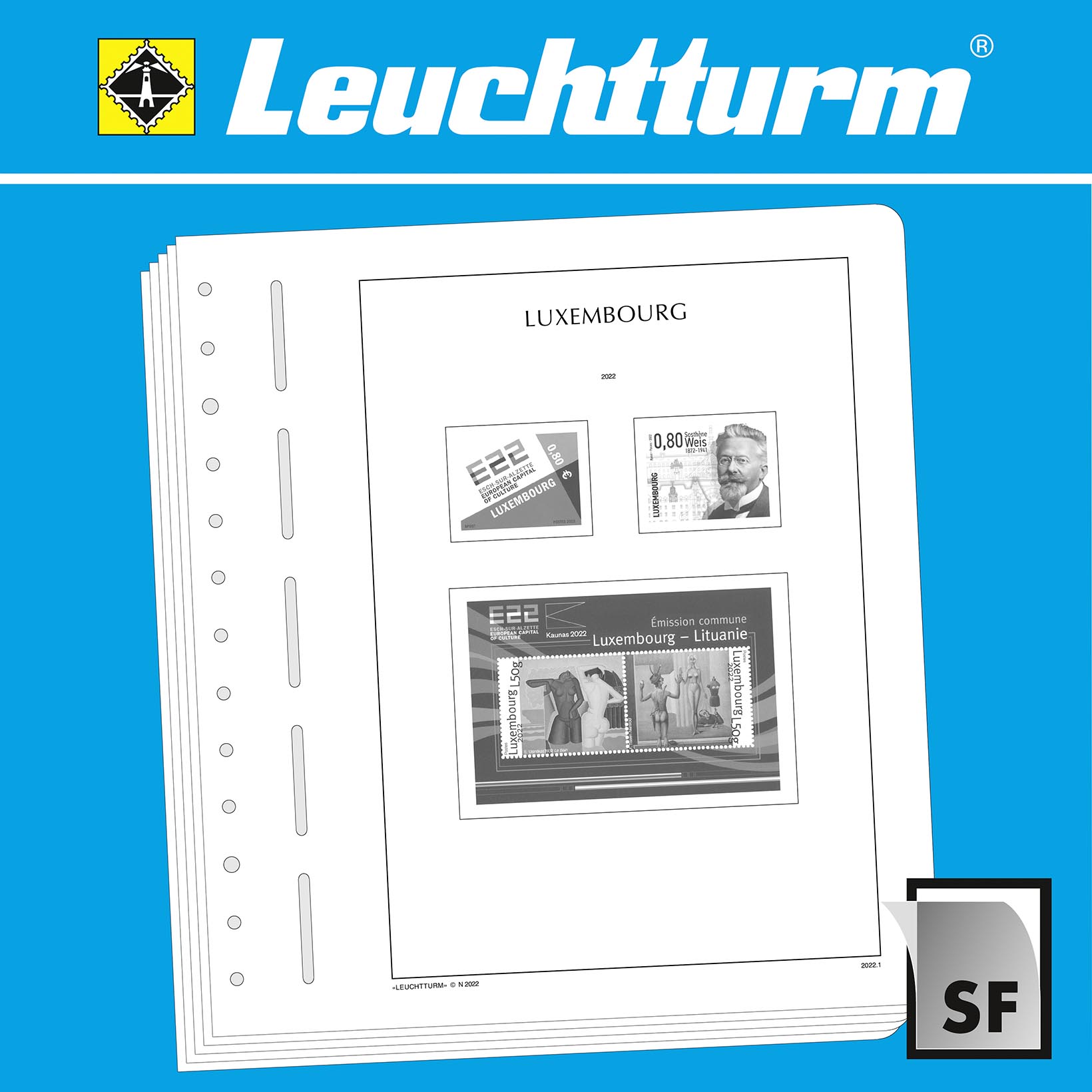 LEUCHTTURM Albenblätter (Format 270 x 297 mm/ 13-Loch-System) werden im detailgetreuen schwarz–weiß Offsetdruckauf alterungsbeständigem, holz- und säurefreiem Karton (170 g/m 2 ) gedruckt. Wir verzichten bewusst auf einen Farbdruck. Dies dient als Orientierungshilfe, damit Sie auf einen Blick sehen, welche Marken Ihnen noch fehlen. In der Größe des Markenvordrucks sind SF-Schutztaschen aus weichmacherfreier, glasklarer, entspiegelter Polystyrol-Folie auf den Albenkarton geklebt. Die Schutztaschen halten die Briefmarken präzise an ihrem Platz und verhindern ein Festkleben. Gleichzeitig bieten sie auch einen optimalen Schutz gegen Staub und Beschädigungen.