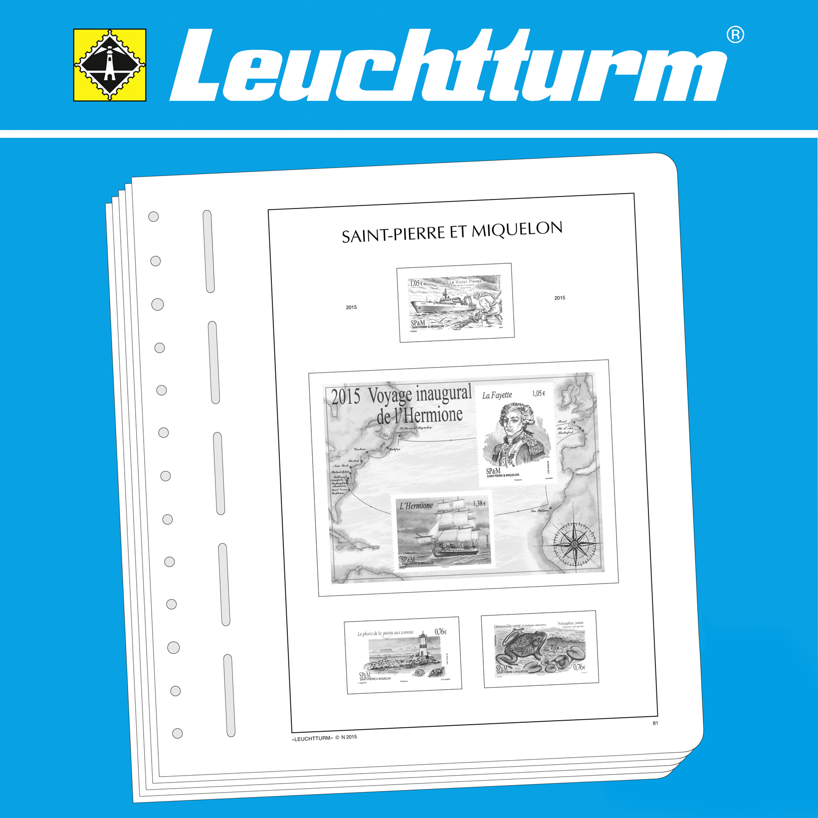 LEUCHTTURM Albenblätter (Format 270 x 297 mm/ 13-Loch-System) werden im detailgetreuen schwarz–weiß Offsetdruckauf alterungsbeständigem, holz- und säurefreiem Karton (170 g/m 2 ) gedruckt. Wir verzichten bewusst auf einen Farbdruck. Dies dient als Orientierungshilfe, damit Sie auf einen Blick sehen, welche Marken Ihnen noch fehlen. In der Größe des Markenvordrucks sind SF-Schutztaschen aus weichmacherfreier, glasklarer, entspiegelter Polystyrol-Folie auf den Albenkarton geklebt. Die Schutztaschen halten die Briefmarken präzise an ihrem Platz und verhindern ein Festkleben. Gleichzeitig bieten sie auch einen optimalen Schutz gegen Staub und Beschädigungen.