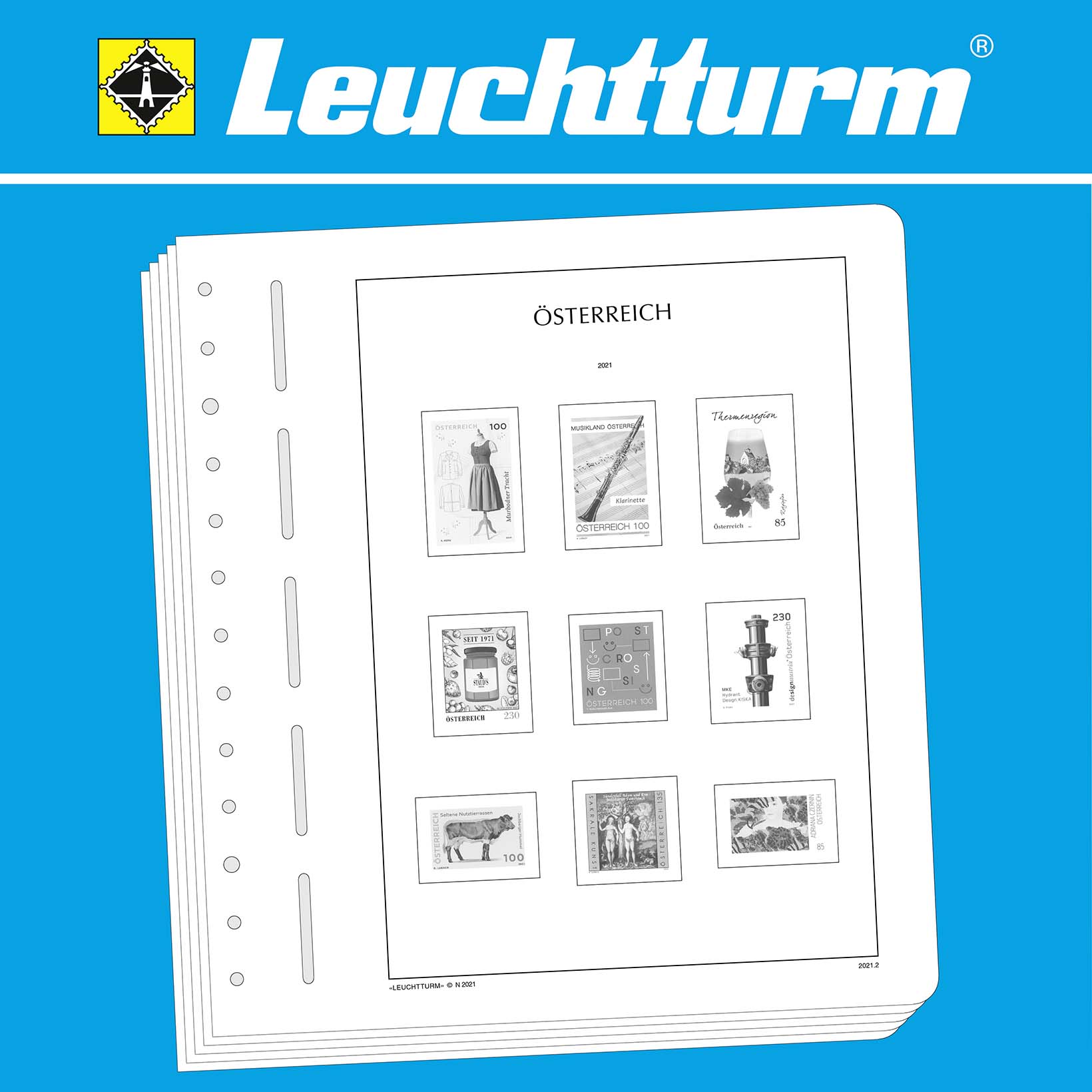 LEUCHTTURM Albenblätter (Format 270 x 297 mm/ 13-Loch-System) werden im detailgetreuen schwarz–weiß Offsetdruckauf alterungsbeständigem, holz- und säurefreiem Karton (170 g/m 2 ) gedruckt. Wir verzichten bewusst auf einen Farbdruck. Dies dient als Orientierungshilfe, damit Sie auf einen Blick sehen, welche Marken Ihnen noch fehlen. In der Größe des Markenvordrucks sind