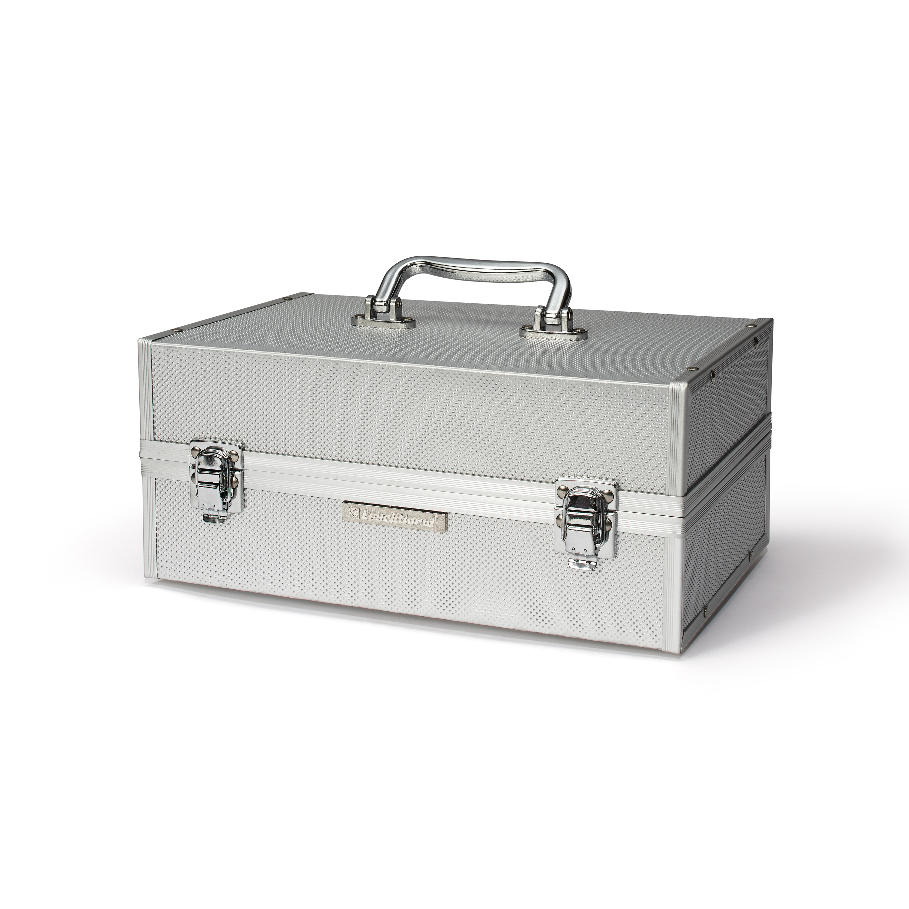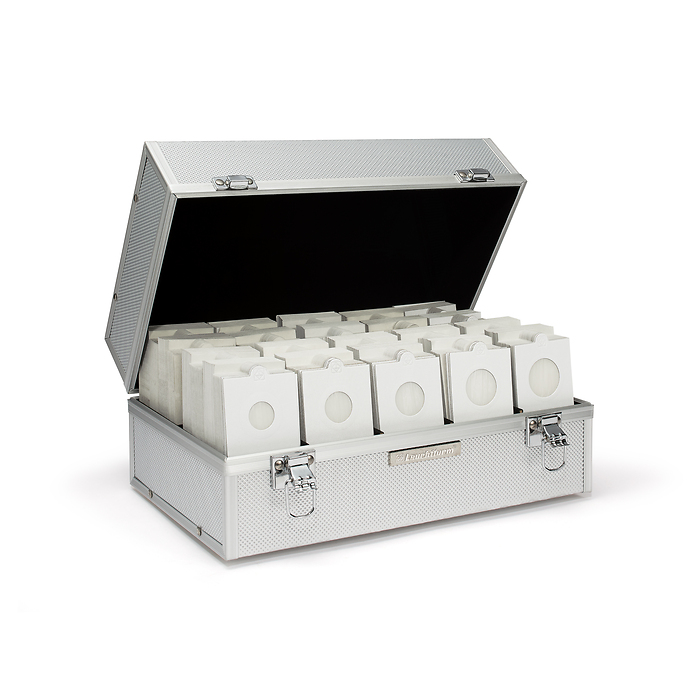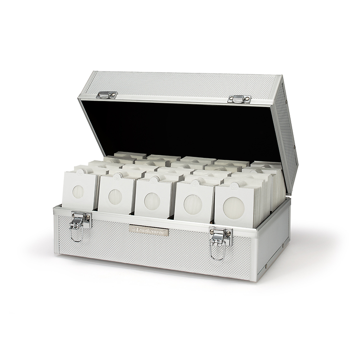 Zur Aufbewahrung der Münzrähmchen erhalten Sie einen praktischen Koffer im Alu-Design GRATIS. So bleiben Ihre Rähmchen immer repräsentativ und übersichtlich sortiert. Auch eignet sich der Koffer ideal für den mobilen Transport. Der stabile Rahmen ist mit Eckbeschlägen aus Aluminium verstärkt. Innen ist der Koffer komplett mit schwarzem Velours ausgekleidet.