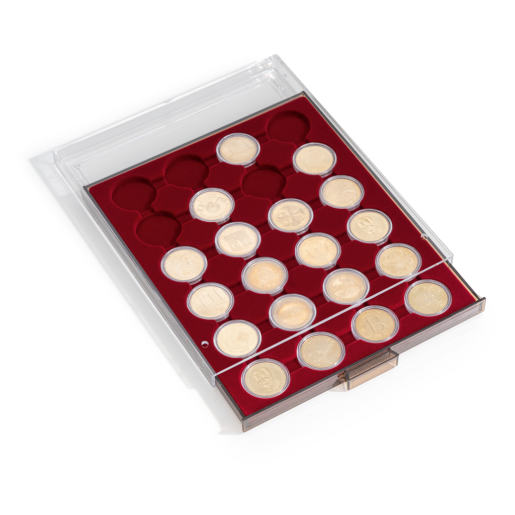 Unsere Münzboxen bieten eine optimale Einteilung mit grauer Schublade, ausgestattet mit einer samtartigen Einlage in dunkelrot. Diese Boxen sind speziell für alle Leuchtturm Münzkapseln konzipiert und bieten doppelten Schutz für Ihre wertvollen Münzen. Die integrierten Stege ermöglichen ein leichtes Herausnehmen der Münzkapseln. Darüber hinaus können die Münzboxen nach Belieben erweitert werden und sind stapelbar. Bitte beachten Sie, dass sich der angegebene Durchmesser bei diesen Münzboxen auf das Münzkapselinnenmaß bezieht. Das Außenformat der Münzboxen beträgt 303 x 236 x 20 mm.