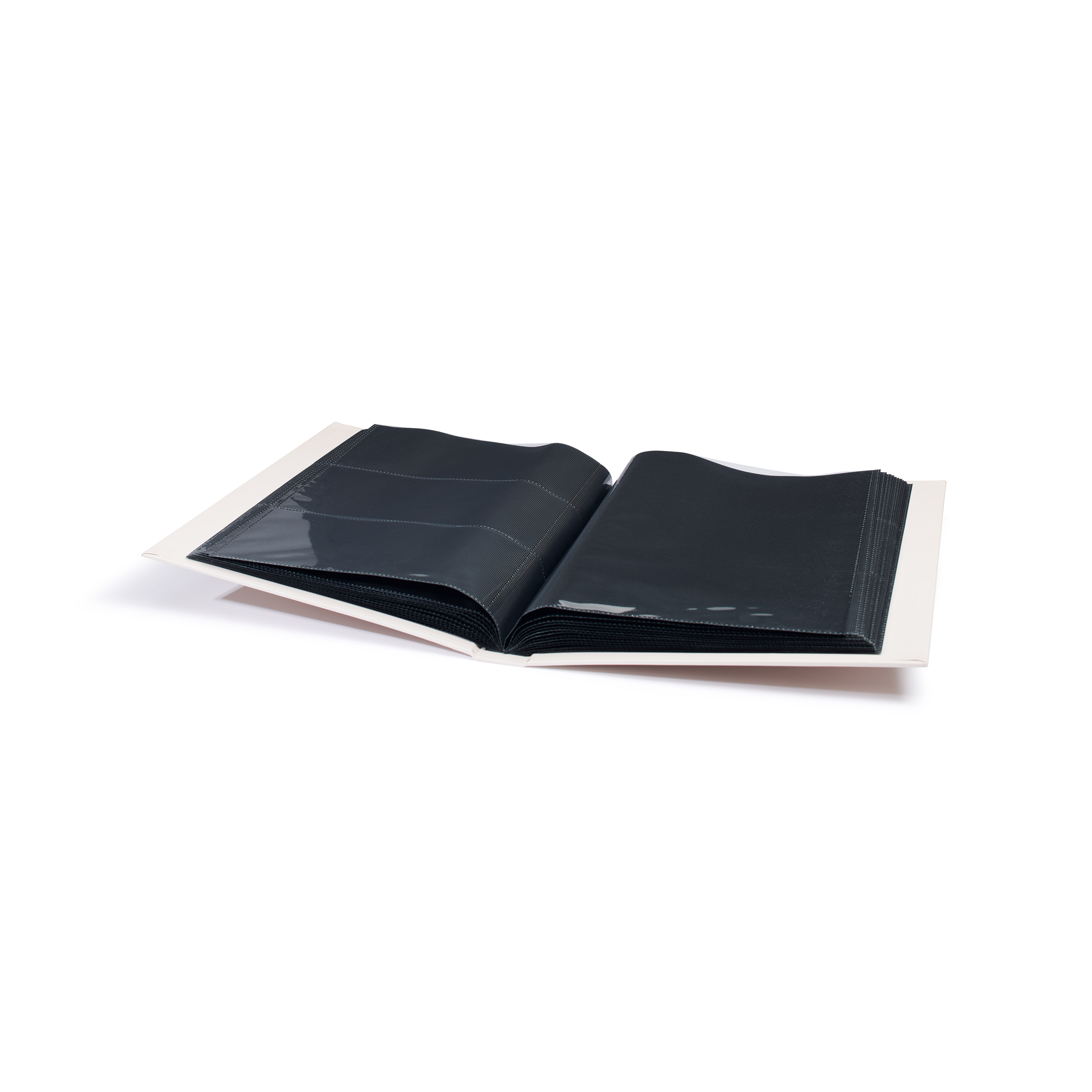 Das Ticketalbum bietet Platz für bis zu 148 Tickets und Karten und sorgt dafür, dass diese sicher aufbewahrt werden. Es verfügt über insgesamt 26 festeingebundene, doppelseitige Hüllen aus hochwertigem, weichmacherfreiem Kunststoff mit schwarzen Zwischenlagen, die die Tickets perfekt zur Geltung bringen. Davon sind 24 Hüllen mit jeweils drei Taschen pro Seite (Innenmaß 220 x 98 mm) ausgestattet. Die Taschen sind nach oben hin offen, sodass die Tickets einfach eingelegt werden können. Zwei weitere doppelseitige Hüllen in der Mitte des Albums bieten jeweils eine Tasche pro Seite (Innenmaß 220 x 304 mm) und bieten ausreichend Platz für Tickets in Übergröße, Sonderformate, Flyer oder Broschüren bis zum A4-Format.