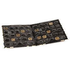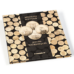 Münzalbum aus farbig bedrucktem, stabilen Karton mit passgenauen Ausstanzungen zum Eindrücken von 50 französischen "Médailles Souvenirs" (Touristik-Medaillen mit einem Durchmesser von 34 mm). Außenformat: 255 x 280 mm