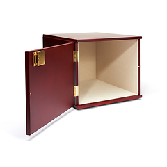 Hochwertiges, mahagonifarbenes Kabinett für bis zu 10 Münzboxen MB bzw. 6 Münzboxen XL. Durch die edle Optik auch ideal als Möbelstück zu platzieren. Mit hellem Filz ausgekleidet, abschließbar (2 Schlüssel). Außenformat: 260 x 230 x 343 mm. Hinweis: Münzboxen sind nicht im Lieferumfang enthalten