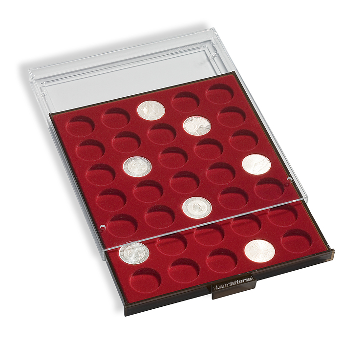 Unsere Münzboxen mit Einteilungen und grauen Schubladen bieten eine samtartige Einlage in burgunderfarbend, die Ihre Münzen stilvoll präsentiert. Diese Münzboxen ist für alle gängigen Münzen geeignet, erweiterbar und stapelbar. Die samtartigen Einlagen sorgen für eine hochwertige Optik und sicheren Halt Ihrer Münzen, die genau in die Vertiefungen passen. Durch Fingerdruck lassen sich die Münzen leicht herausdrücken. Das Außenformat beträgt 236 x 20 x 303 mm. (Der Durchmesser bezieht sich bei diesen Münzenboxen auf die runde Facheinteilung.)