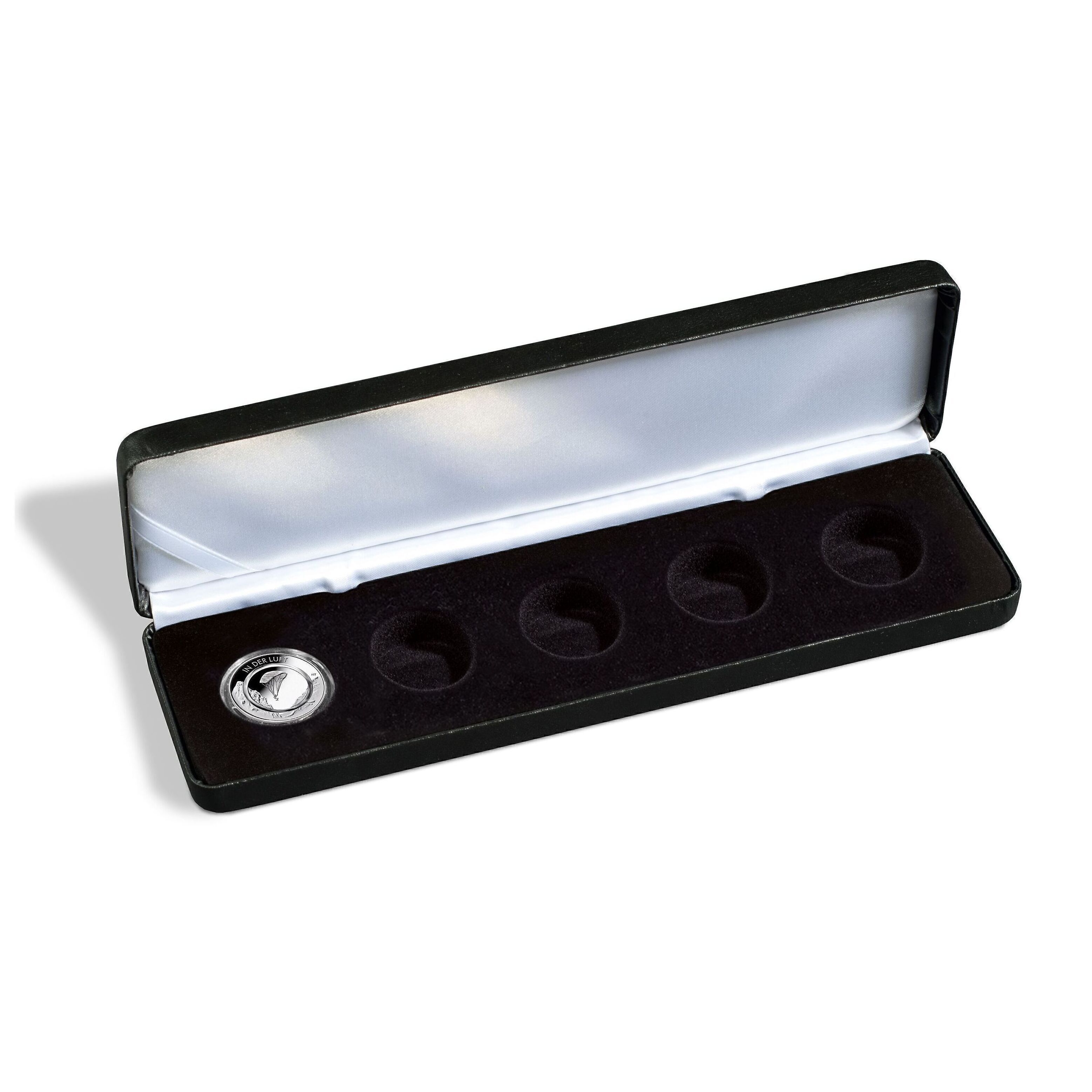 Dieses edle Münzetui in Lederoptik dient zur Unterbringung von fünf deutschen 10 Euro-Sammlermünzen der Serie „Luft bewegt“ in Kapseln (InnenØ 29 mm). Stabiles Metallgehäuse mit schwarzem, fein genarbtem, wattiertem Kunstleder überzogen. Einlage mit schwarzer, veloursartiger Oberfläche und fünf runden Feldern (Ø 35 mm). Deckelkissen mit weißem Satin gepolstert. Inkl. weißem Satinbändchen zur Aufnahme eines Zertifikates. Edle, silberfarbene Deckelprägung. Außenformat: 235 x 65 x 25 mm. Kapseln nicht im Lieferumfang enthalten.