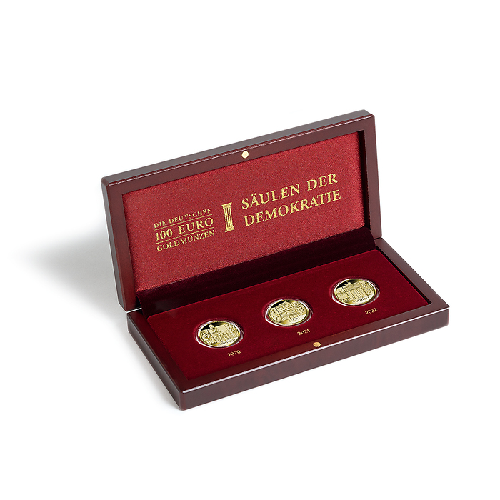 Münzetui in edler, mahagonifarbener Holzmaserung zur Unterbringung der 3 deutschen 100-Euro-Goldmünzen der Serie „Säulen der Demokratie“ in Originalkapseln. 1 Einlage mit roter, veloursartiger Oberfläche und 3 runden Feldern (Ø 33,5 mm). Goldfarbener Deckel- und Kissendruck mit Münzmotiv. Deckelkissen mit rotem Satin gepolstert. Sicherer und unauffälliger Magnetverschluss.