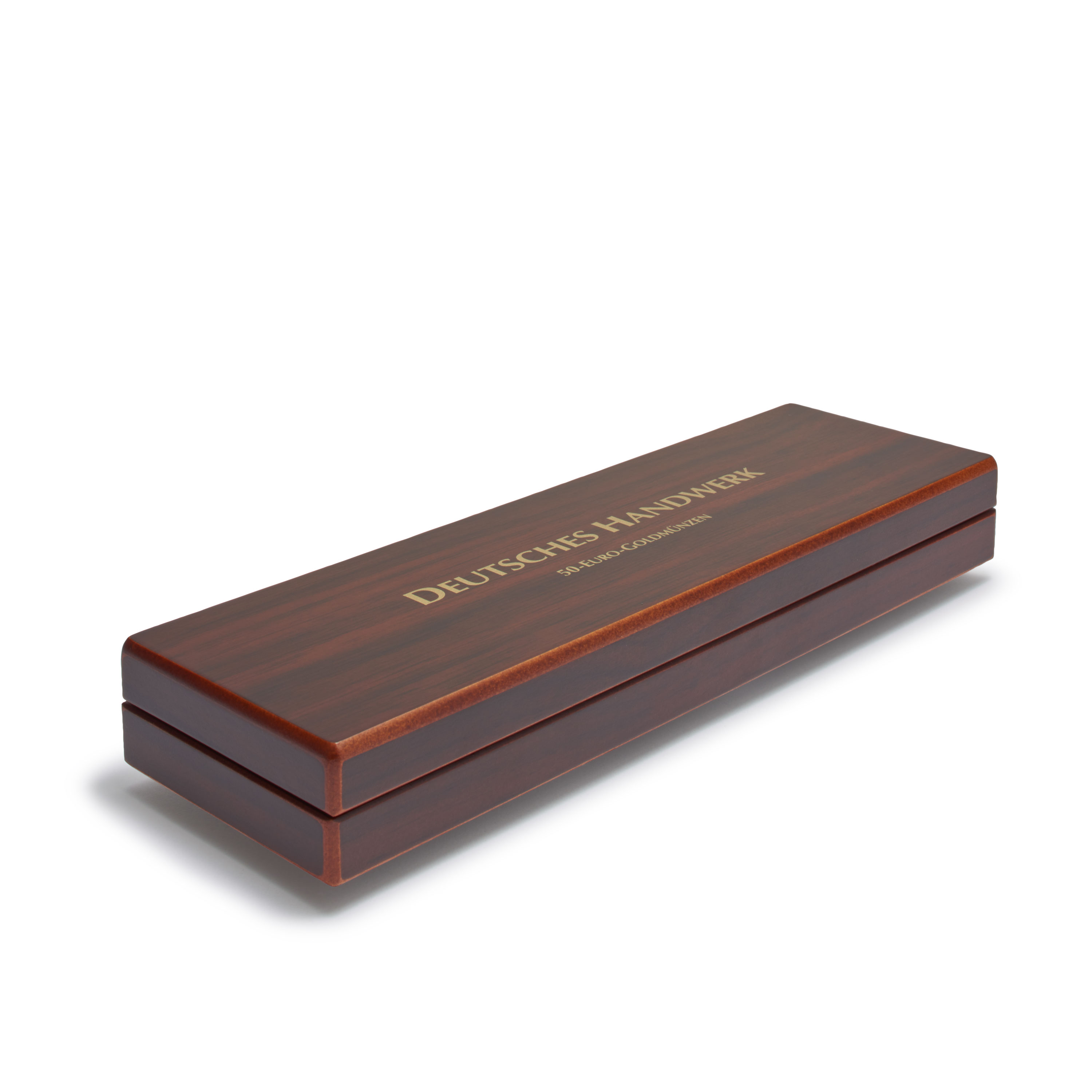 Münzetui zur Unterbringung der 5 deutschen 50-Euro-Goldmünzen der Serie „Deutsches Handwerk“ 2023 – 2027 in Originalkapseln. Edle, mahagonifarbene Holzmaserung. Bodenteil mit 5 Vertiefungen und roter, veloursartiger Oberfläche. Hochwertiger, themenspezifischer Deckel- und Kissendruck. Deckelkissen mit rotem Satin ausgepolstert. Mit Zertifikatsbändchen im Deckelkissen. Sicherer und unauffälliger Magnetverschluss. Außenformat: 260 x 80 x 30 mm.