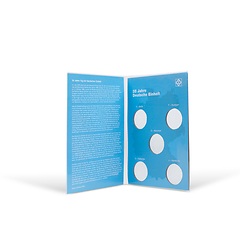 Sammelkarte aus stabilem Karton mit Ausstanzungen für die 5 deutschen 2-Euro-Gedenkmünzen 2025 „35 Jahre deutsche Einheit“ (Prägebuchstaben A, D, F, G, J). Untergebracht in einer glasklaren, weichmacherfreien Kunststofffolie. Die Münzen sind beidseitig zu betrachten. Mit interessanten Hintergrundinformationen und Bildmaterial. Außenformat: 106 x 144 mm.