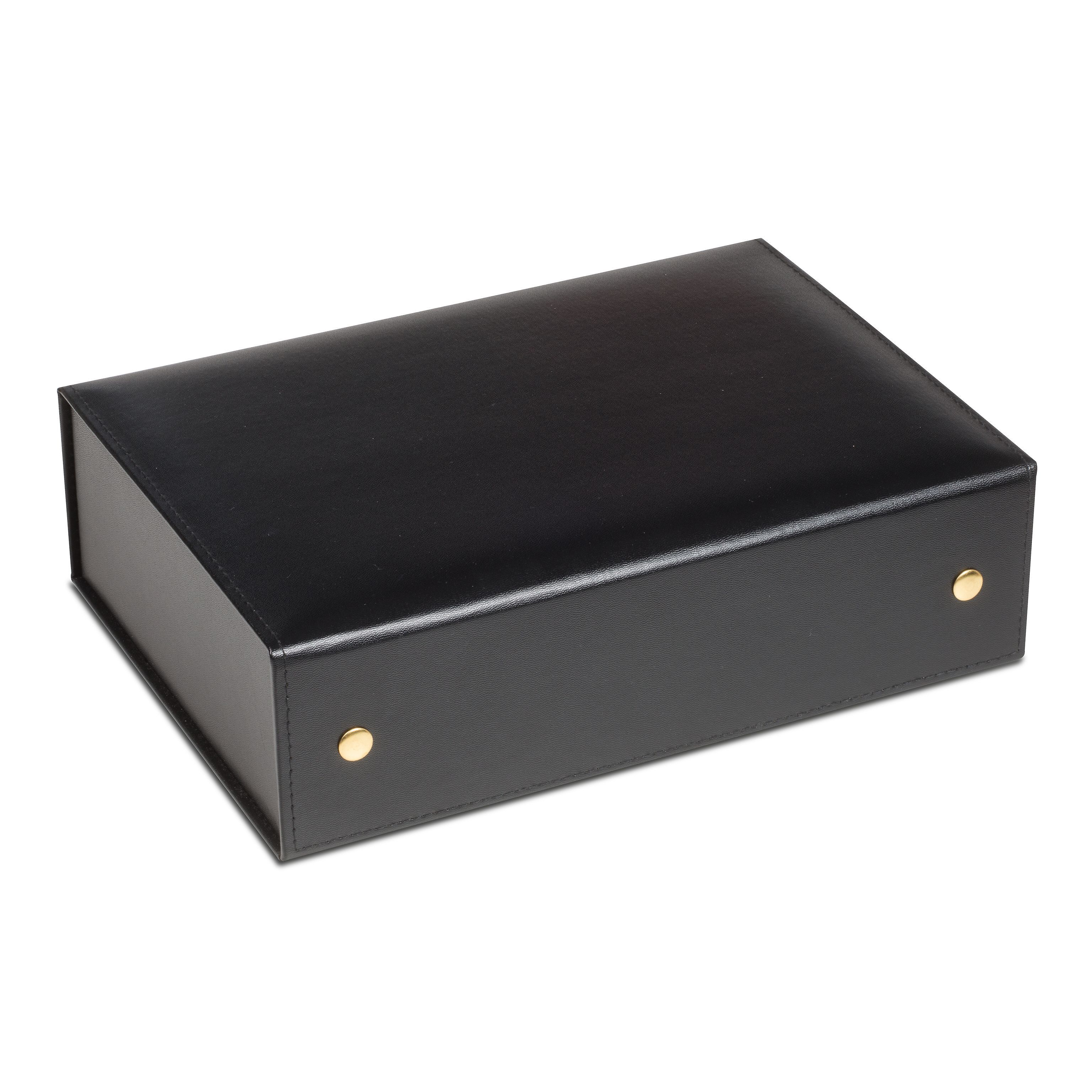 Die Münzkassette aus wattiertem, schwarzem Kunstleder verfügt über ein extra großes Fassungsvermögen. Kassette ohne Inhalt zum individuellen Bestücken, passend für bis zu 10 Tableaus TAB im L-Format (abhängig vom Tableaus). Der dreifach gefaltete Deckel kann so aufgeklappt werden, dass er als Arbeitsunterlage dient. Der V-förmige Einschnitt erleichtert das Einlegen sowie die Entnahme der Tableaus. 2 goldfarbene Druckverschlussknöpfe. Außenformat: 360 x 105 x 250 mm.