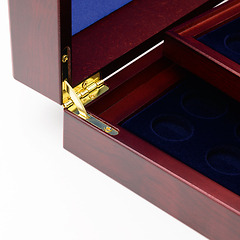 Unsere Münzkassette in mahagonifarbener Holzmaserung ist die ideale Aufbewahrungslösung für 24 Euro-Kursmünzensätze in Kapseln (1 Cent bis 2 Euro). Die Kassette wird inklusive 4 Einlagen geliefert, die jeweils eine veloursartige Oberfläche in Blau haben und mit je 48 runden Feldern für je 6 Euro-Kursmünzensätze ausgestattet sind. Die Einlagen sind durch eine Holzrahmung besonders stabil. Der Deckelkissen ist mit blauem Satin gepolstert und mit einem silberfarbenen Druck verziert. Ein sicherer und unauffälliger Magnetverschluss sorgt für die sichere Aufbewahrung der Münzen. Das Außenformat der Kassette beträgt 332 x 272 x 68 mm.