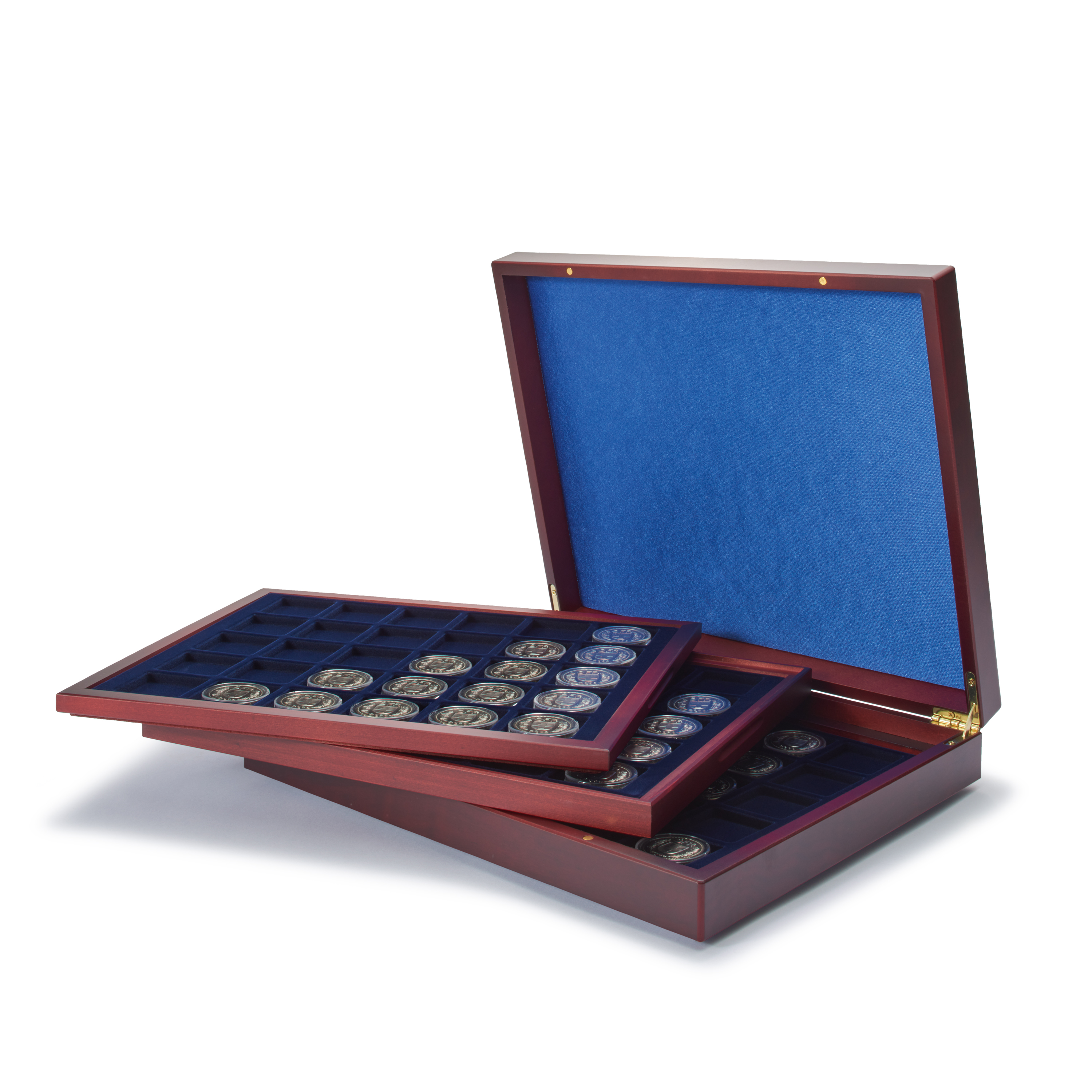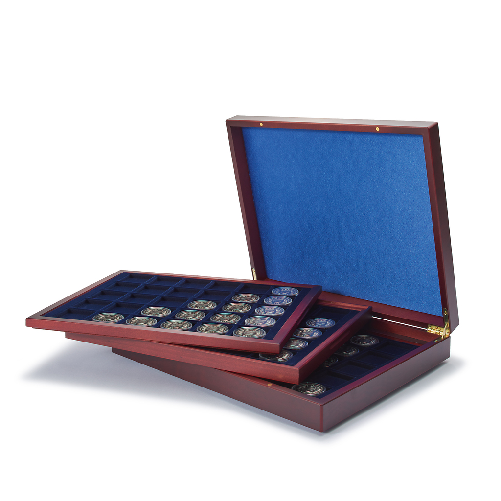 Münzkassette für deutsche 10-EUR-Gedenkmünzen. Hochwertige Münzkassette in mahagonifarbener Holzmaserung mit einem festen Tableau und zwei herausnehmbaren Holztableau. Deckelkissen mit blauer Seide, Einlagen mit veloursartiger Oberfläche, für jeweils 30 Münzen bis zu einem Durchmesser von 39 mm. Auch geeignet für die deutsche 10-EUR-Gedenkmünzen mit und ohne Kapseln. je 5 x 6 Felder (Ø 39 mm). Außenmaß (L/B/H): 330 x 270 x 55 mm