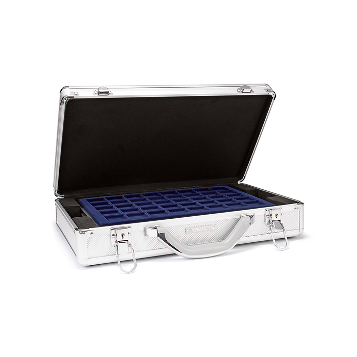 Münzkoffer inkl. 6 Münztableaus im L-Format. Ausgepolsterter Kofferdeckel