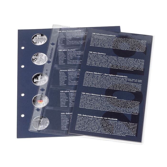Der Nachtrag 2019 für das Vordruckalbum "Dt. 20-Euro-Gedenkmünzen" bietet Ihnen die perfekte Möglichkeit, Ihre Sammlung vollständig und ordentlich zu erweitern. Die Lieferung umfasst ein dunkelblaues PVC-Münzblatt (laminierter Karton) im Optima-Format, das speziell für 20-Euro-Gedenkmünzen entwickelt wurde. Das Blatt verfügt über zwei Schlitze, die oben offen sind und hat eine Größe von 47 x 248 mm (BxH) mit geraden Kanten.