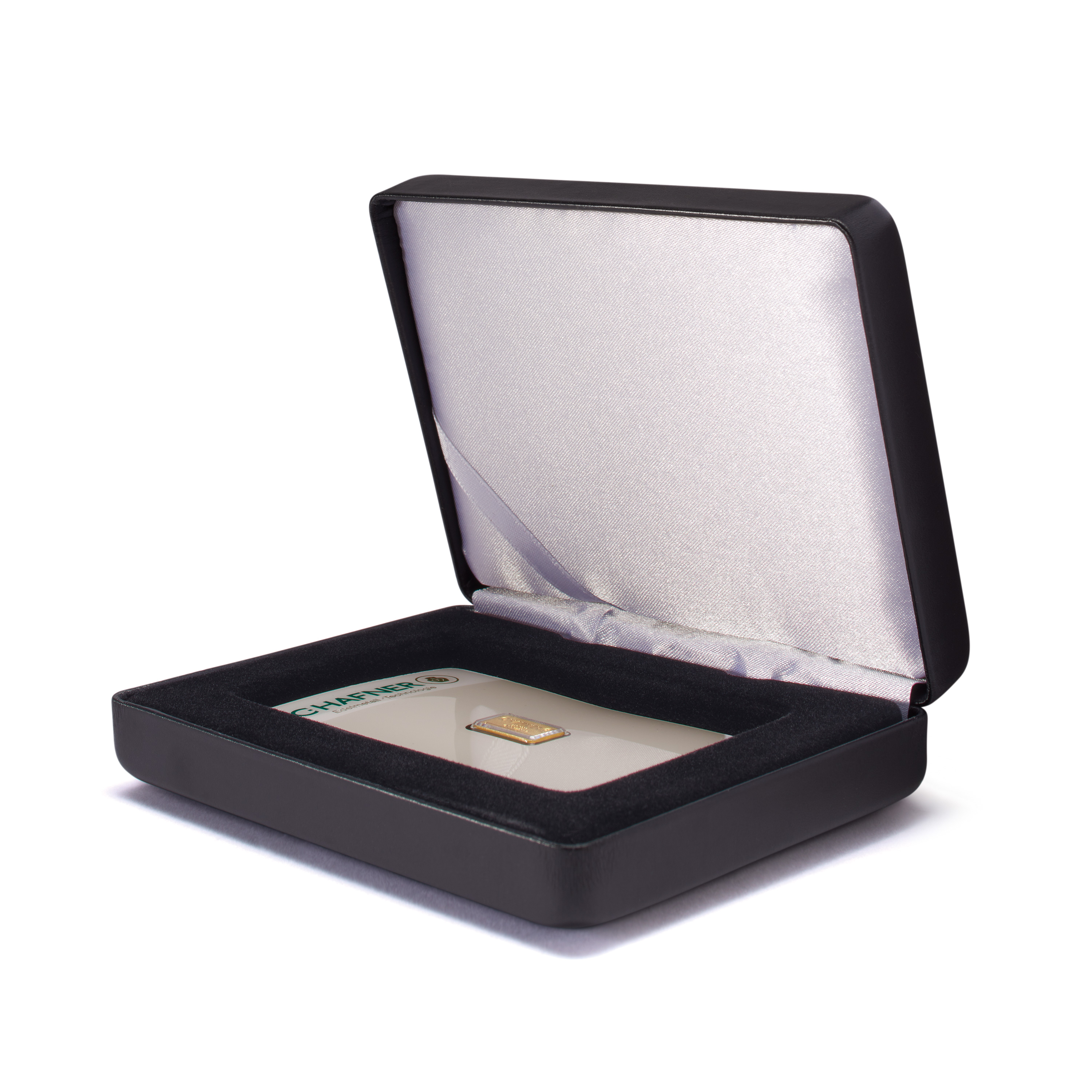 Nobile Etui für einen geprägte Goldbarren in Blisterverpackung im Querformat, schwarz