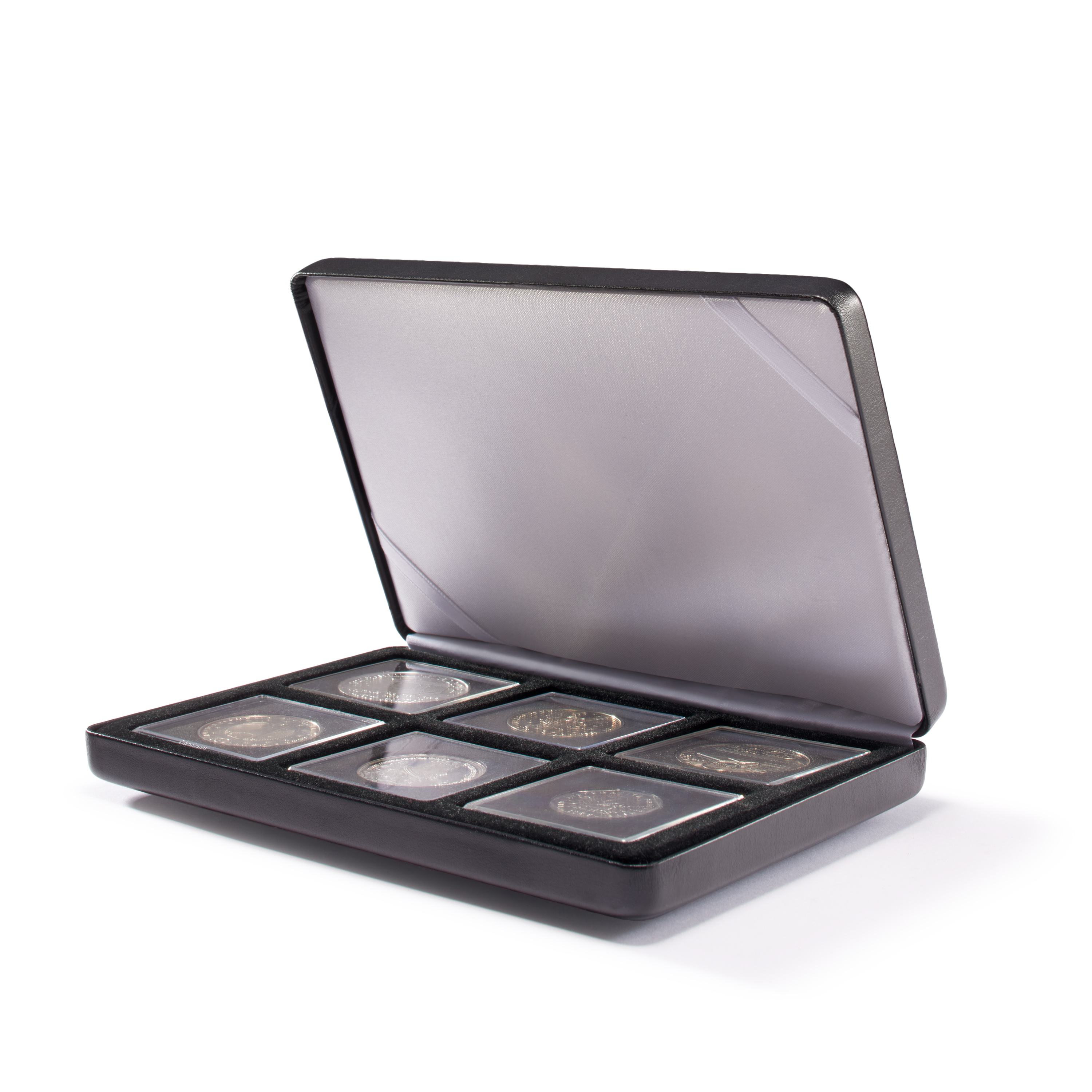 Zur anspruchsvollen Aufbewahrung von gekapselten Münzen empfehlen wir Ihnen diese edlen Münz-Etuis aus Metall. Der seidenmatte, lederähnliche Bezugsstoff sowie die Samteinlage geben diesen Etuis eine besonders edle Anmutung. Im Deckelkissen befindet sich ein Satinbändchen, das zur Aufnahme eines evtl. vorhandenen Zertifikates dient. Durch Ihren hochwertigen Metallkern ist dieses Etui neben der Aufbewahrung auch perfekt für den sicheren Versand geeignet. Passend für unsere QUADRUM Kapseln.