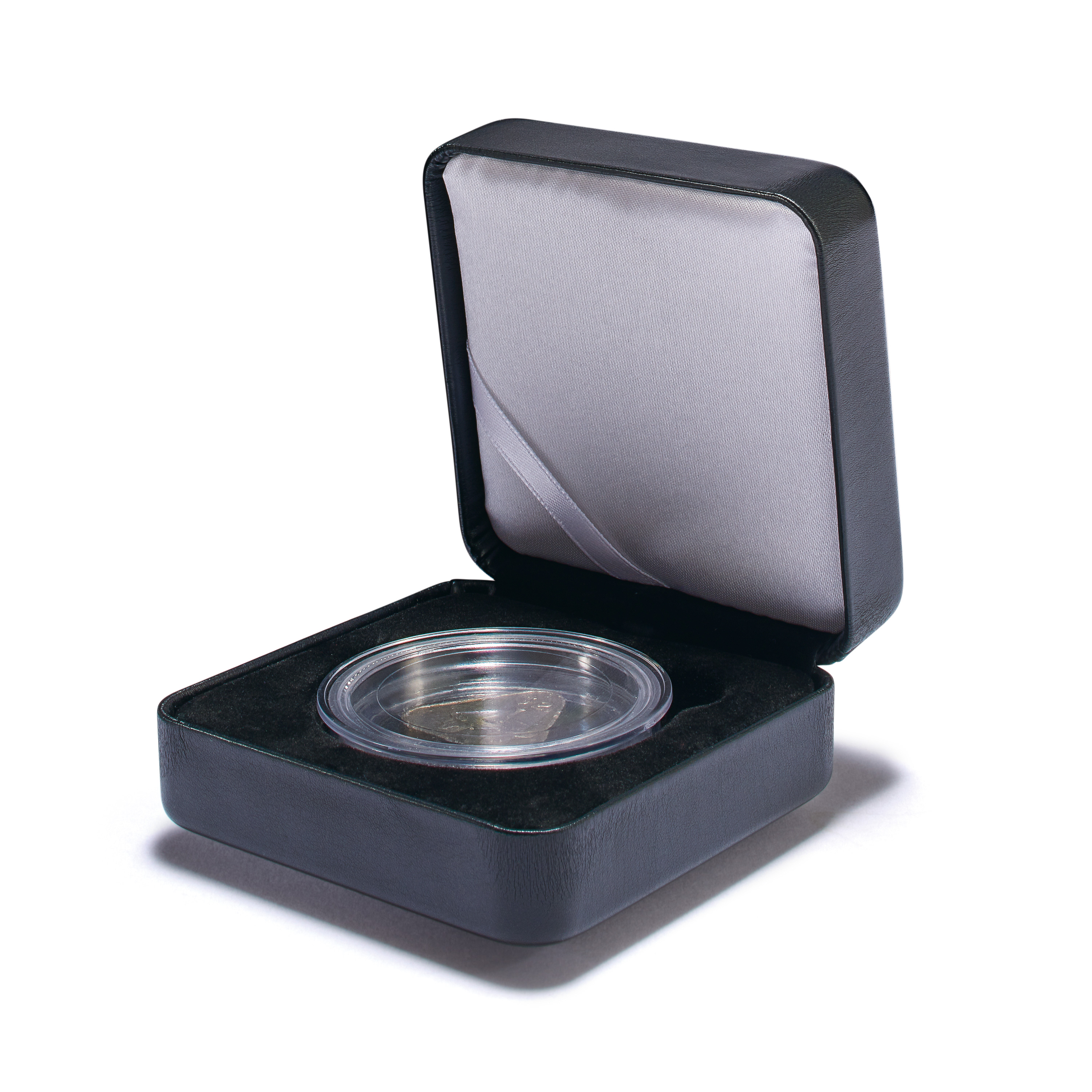 Stabiles Metallgehäuse mit schwarzem, fein genarbtem, wattiertem Kunstleder überzogen. Samteinlage mit schwarzer, veloursartiger Oberfläche und einem runden Feld, passend für LEUCHTTURM MAGIC CAPSULES. Im Deckelkissen befindet sich ein Satinbändchen, das zur Aufnahme eines evtl. vorhandenen Zertifikates dient. Außenformat: 78 x 78 x 39 mm. Lieferung ohne Kapsel.
