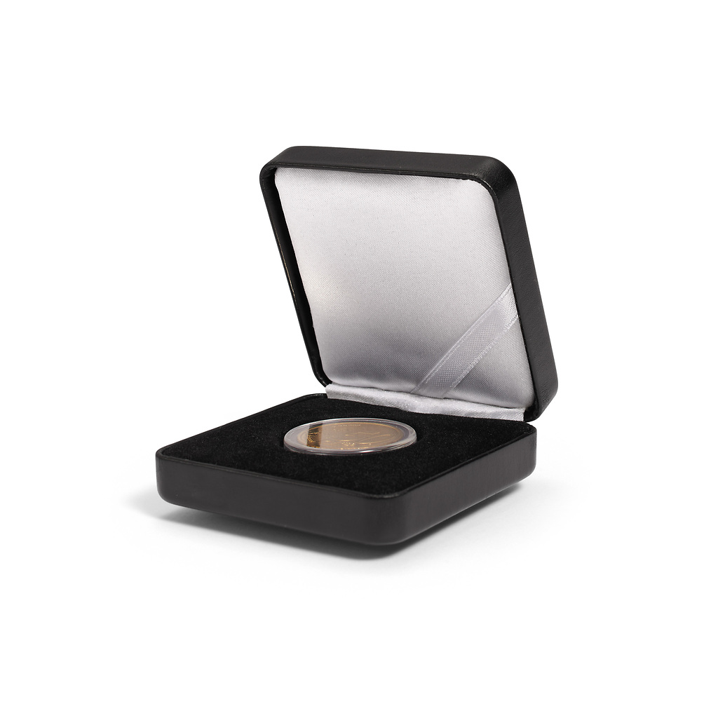 Zur anspruchsvollen Aufbewahrung von gekapselten Münzen empfehlen wir Ihnen diese edlen Münz-Etuis aus Metall. Der seidenmatte, lederähnliche Bezugsstoff sowie die Samteinlage geben diesen Etuis eine besonders edle Anmutung. Im Deckelkissen befindet sich ein Satinbändchen, das zur Aufnahme eines evtl. vorhandenen Zertifikates dient. Durch Ihren hochwertigen Metallkern ist dieses Etui neben der Aufbewahrung auch perfekt für den sicheren Versand geeignet.Etui. Maße: 65 x 65 x 26 mm