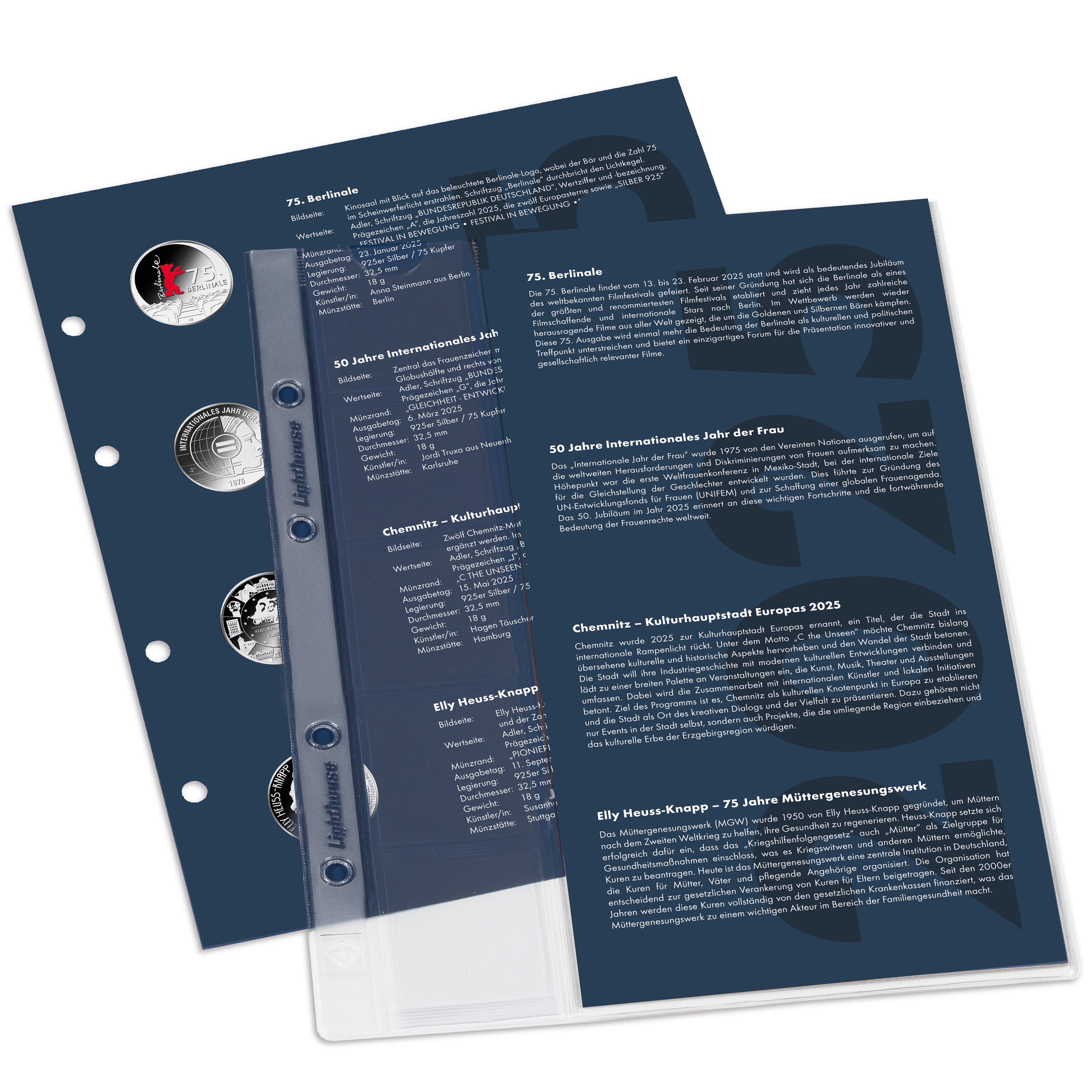 Unsere Vordruckblätter bieten detaillierte Abbildungen und Informationen zum jeweiligen Jahr und sind speziell auf die Bedürfnisse von Münzsammlern zugeschnitten. Jedes Set enthält ein Münzblatt im Format 250 x 200 mm. Die Vordruckblätter umfassen Abbildungen und Informationen zur jeweiligen Münze. Des Weiteren gibt es ein Zusatzblatt mit detaillierten Hintergrundinformationen der Ausgaben. Alle Hintergrundinformationen sind in deutscher Sprache verfasst.