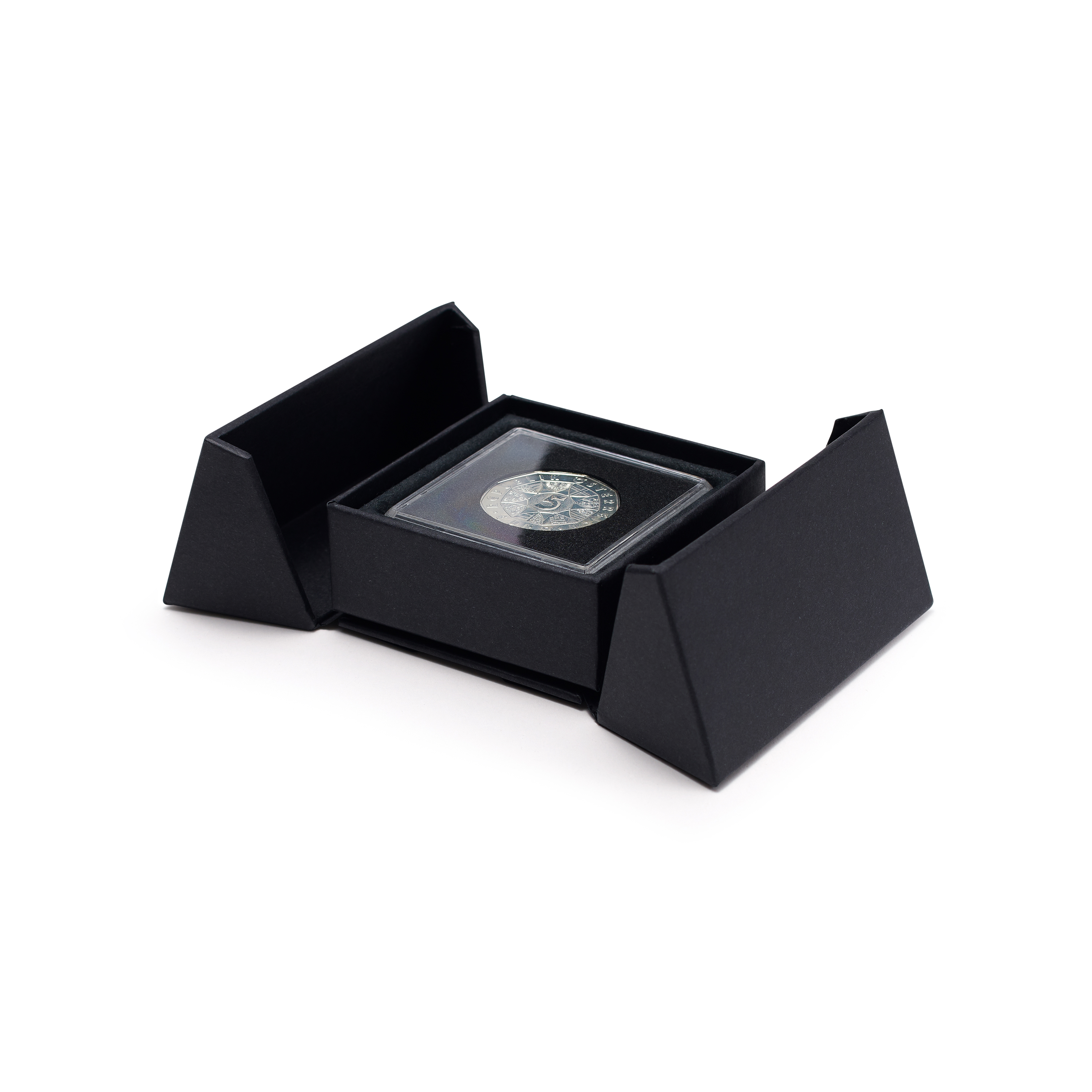 Das Aufklappen der Türen dieses vollständig aus Papier gefertigtem Etuis sorgen für ein echtes Erlebnis, wenn Sammler einen ersten Blick auf Ihre neue Münze werfen.