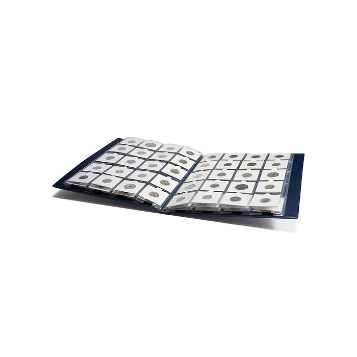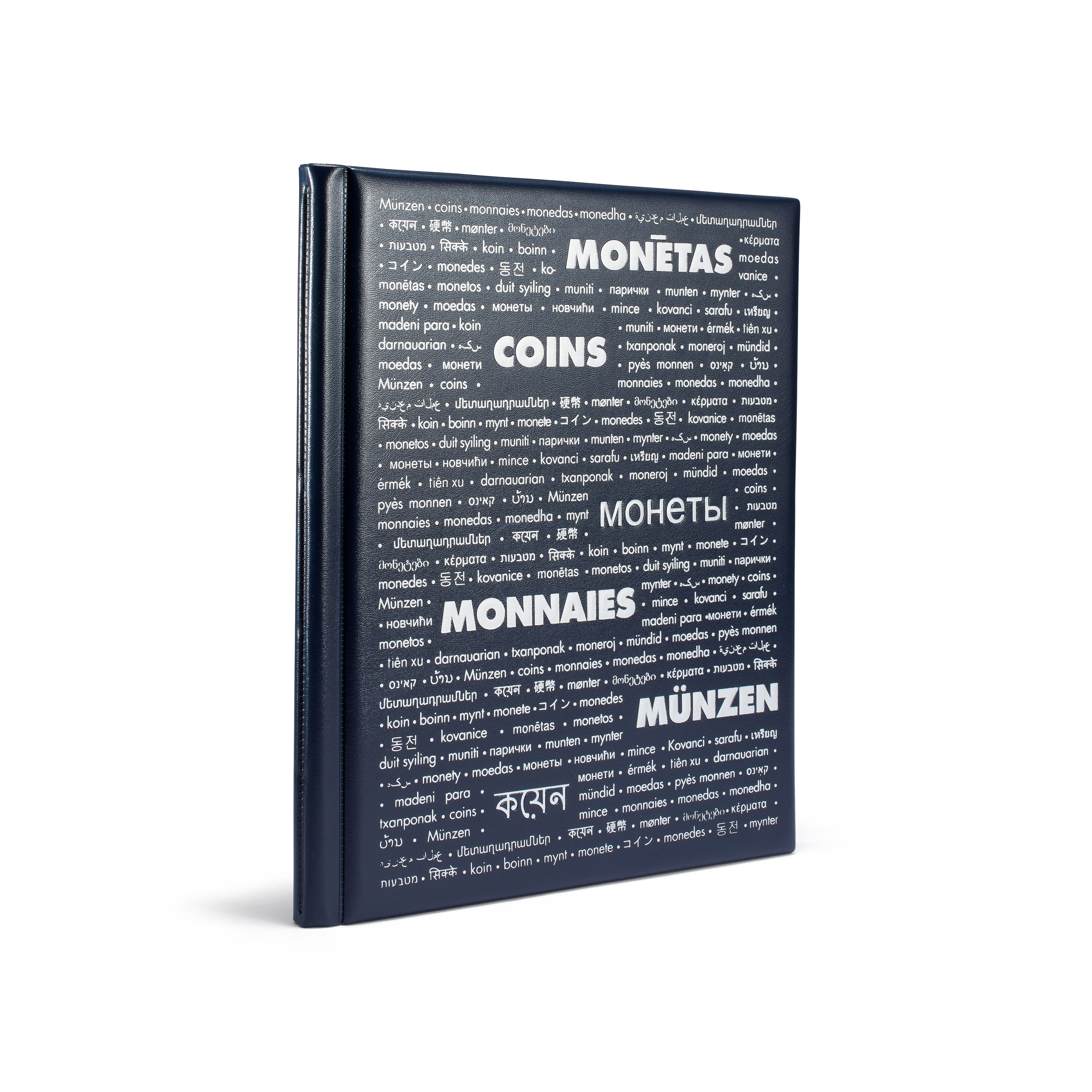 Dunkelblaues Album zur Unterbringung von 200 Münzrähmchen. Mit 10 stabilen, festeingebundenen Hüllen für 20 Münzrähmchen pro Hülle. Wattierter Einband mit silberfarbener Deckelprägung. Außenformat: 245 x 307 x 40 mm