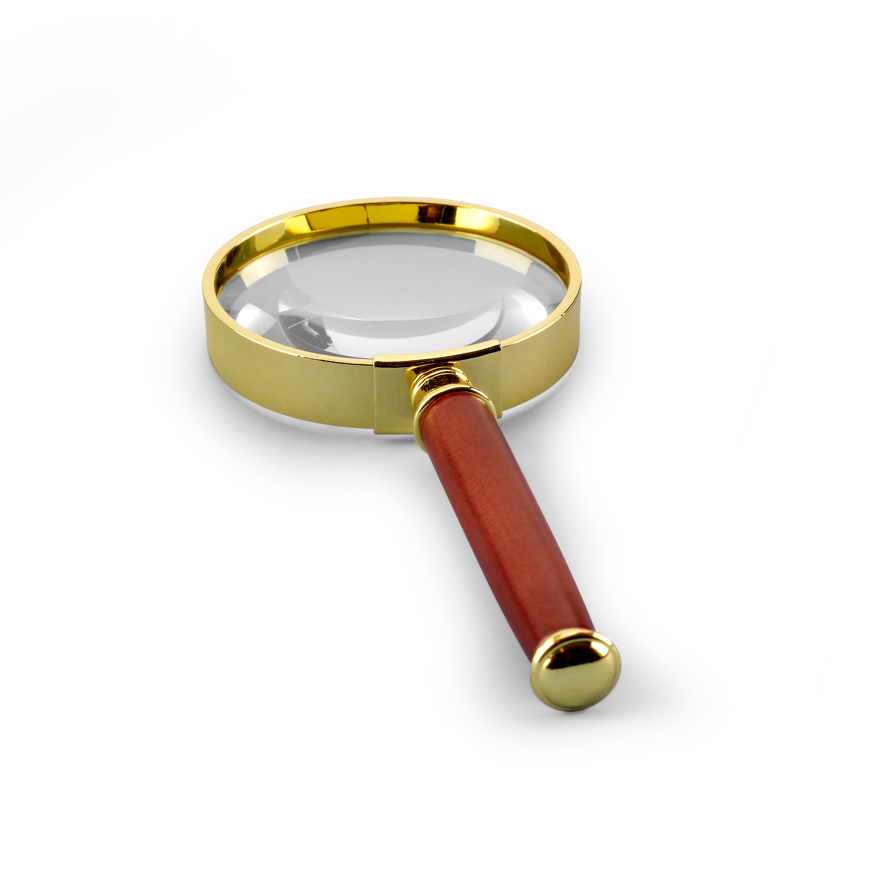 Handliche Stiellupe mit vergoldetem Metall-Rahmen und Rosenholzgriff. Mit 3-facher Vergrößerung. Hochwertige Glaslinse, Linsendurchmesser: 50 mm. Sehr gutes Einblickverhalten