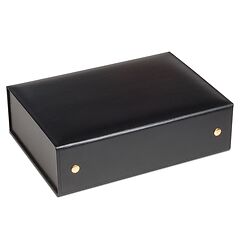 Die Münzkassette aus wattiertem, schwarzem Kunstleder verfügt über ein extra großes Fassungsvermögen. Kassette ohne Inhalt zum individuellen Bestücken, passend für bis zu 10 Tableaus TAB oder TAB PROTECTOR im L-Format. Der dreifach gefaltete Deckel kann so aufgeklappt werden, dass er als Arbeitsunterlage dient. Der V-förmige Einschnitt erleichtert das Einlegen sowie die Entnahme der Tableaus. 2 goldfarbene Druckverschlussknöpfe. Außenformat: 360 x 105 x 250 mm.