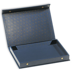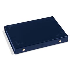 Dunkelblaue Münzkassette ohne Münztableaus aus hochwertigem Kunstleder mit Ornamentprägung auf dem Deckel, buchbinderische Verarbeitung, 2 messingfarbene Druckverschlußknöpfe. Außenformat (B/L/H): 360 x 250 x 50 mm geeignet für bis zu 4 Tableaus