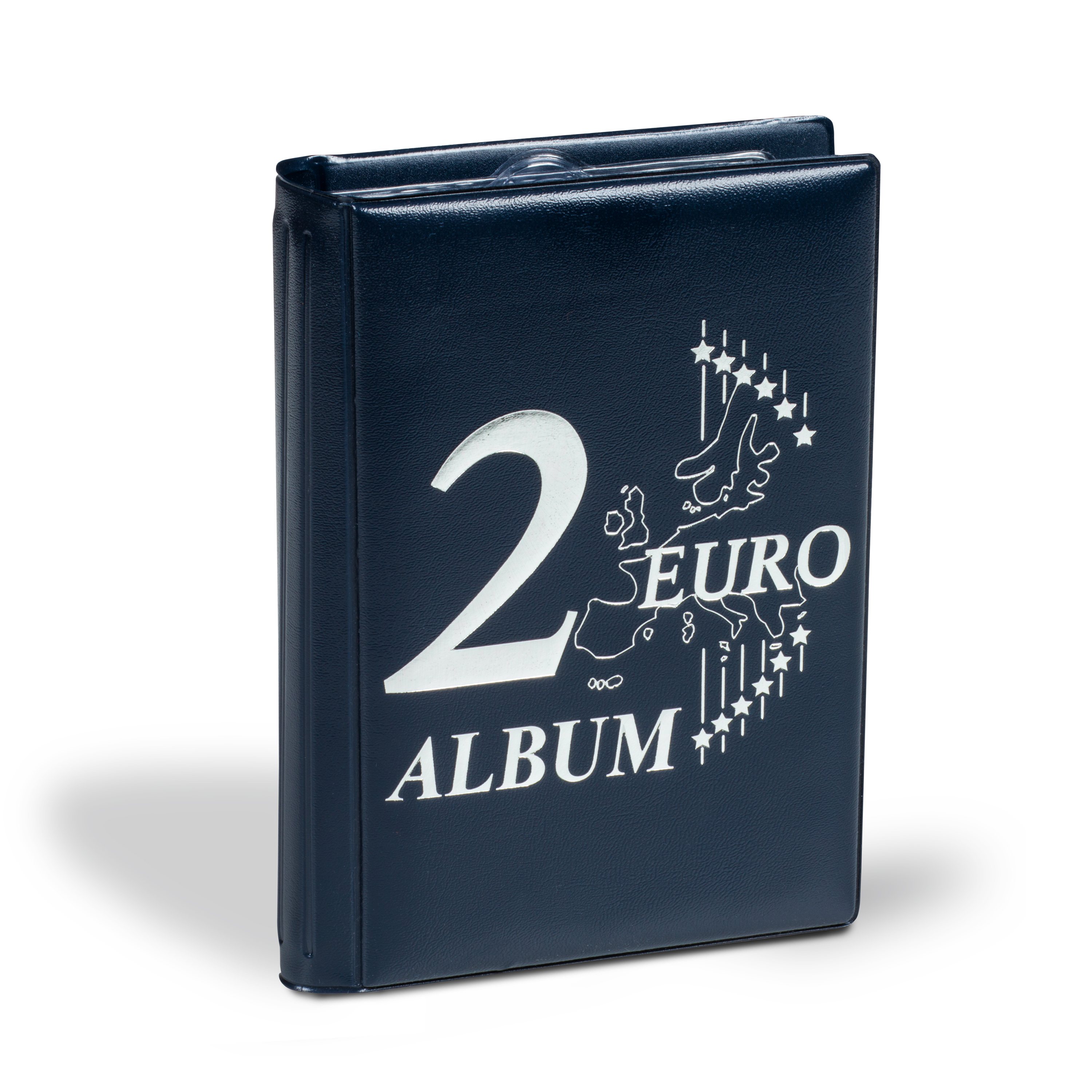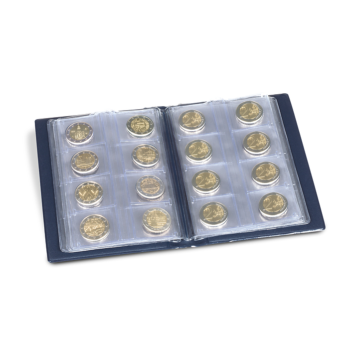 Dieses handliche Taschenalbum zur Unterbringung von 48 2-Euro-Münzen ist optimal für unterwegs und Tauschtage. 6 Münzblätter mit weichmacherfreien Hart-PVC-Einschüben für jeweils 8 2-Euro-Münzen. Mit wattiertem, dunkelblauem Einband und aufwendiger, silberfarbener Deckelprägung.