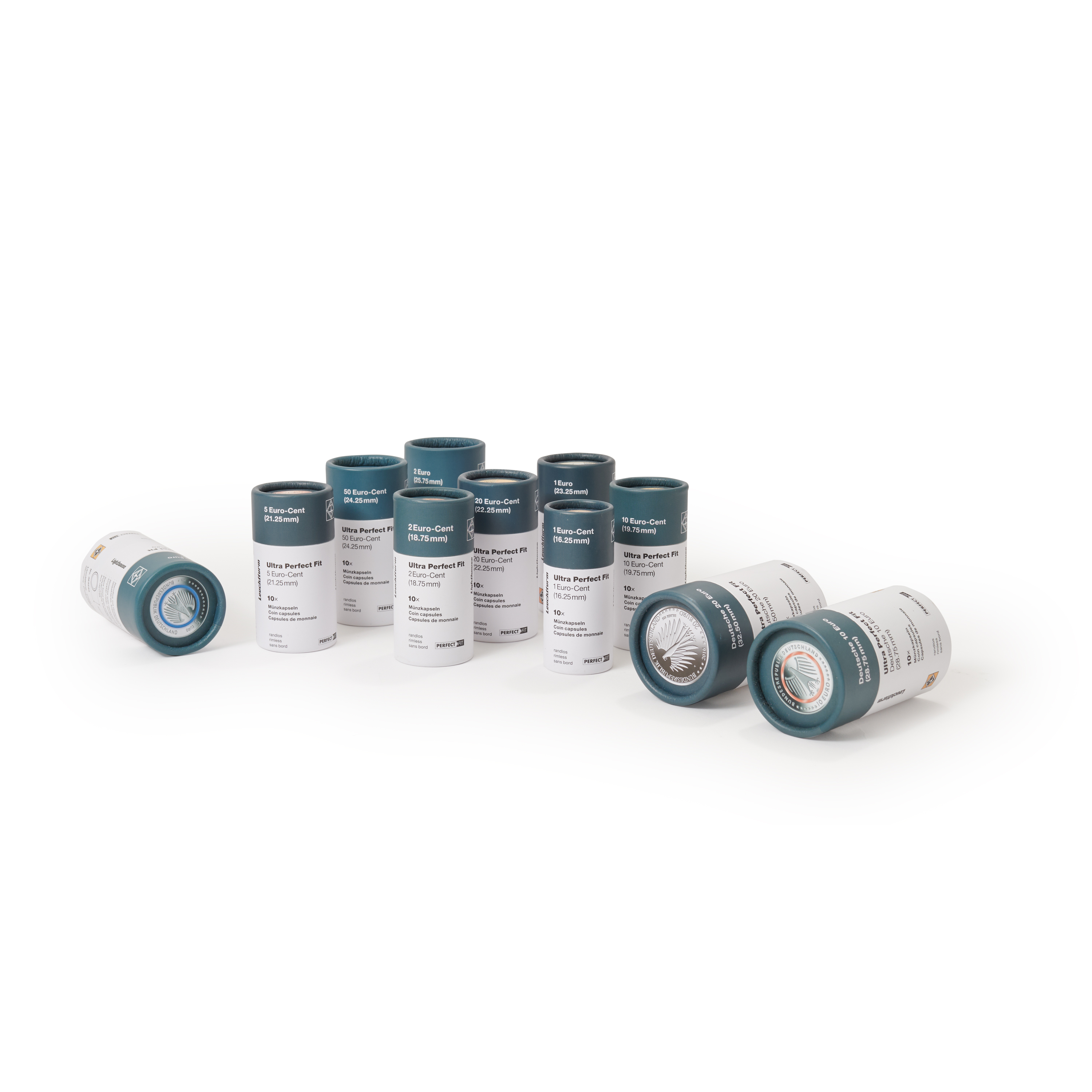 110 Münzkapseln aus hochwertigem, kratzfestem Kunststoff. Festgreifender und gleichzeitig leicht zu öffnender Verschluß (die Kapseln sind ohne Griffrand). Das Leuchtturm Münzkapsel Sortiment setzt sich wie folgt zusammen: