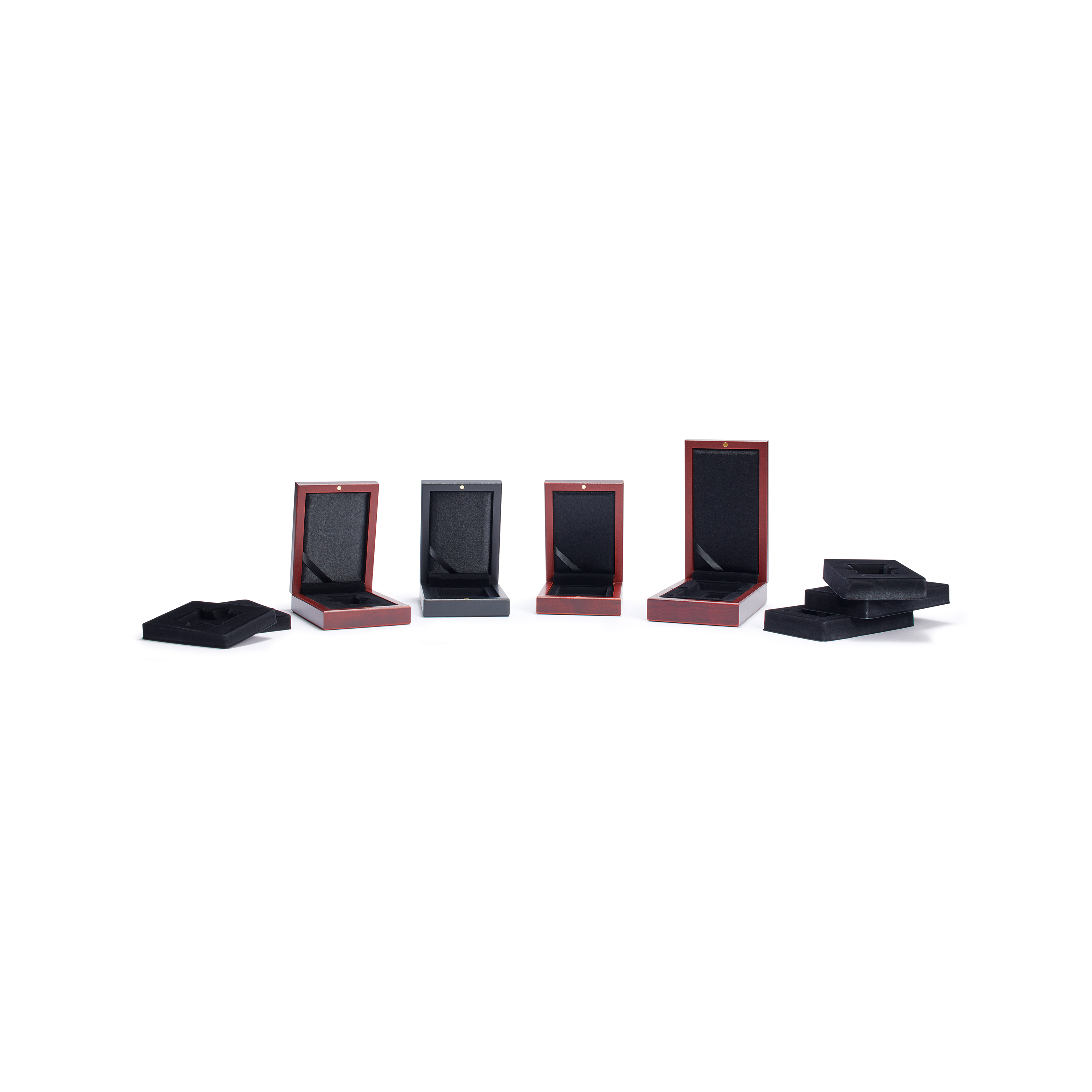 Elegantes Etui in schwarzer und mahagonifarbener Holzmaserung zur stilvollen Aufbewahrung von Goldbarren in Blisterkarten. Der Deckel ist innen mit weichem, schwarzem Satin gepolstert, während das Bodenteil eine edle, veloursartige Oberfläche aufweist. Dank eines integrierten „Kipp-Mechanismus“ lassen sich die Barren besonders leicht entnehmen. Außenformat des Etuis: 120 x 90 x 34 mm, passend für Blisterkarten im Format 86 x 54 mm.