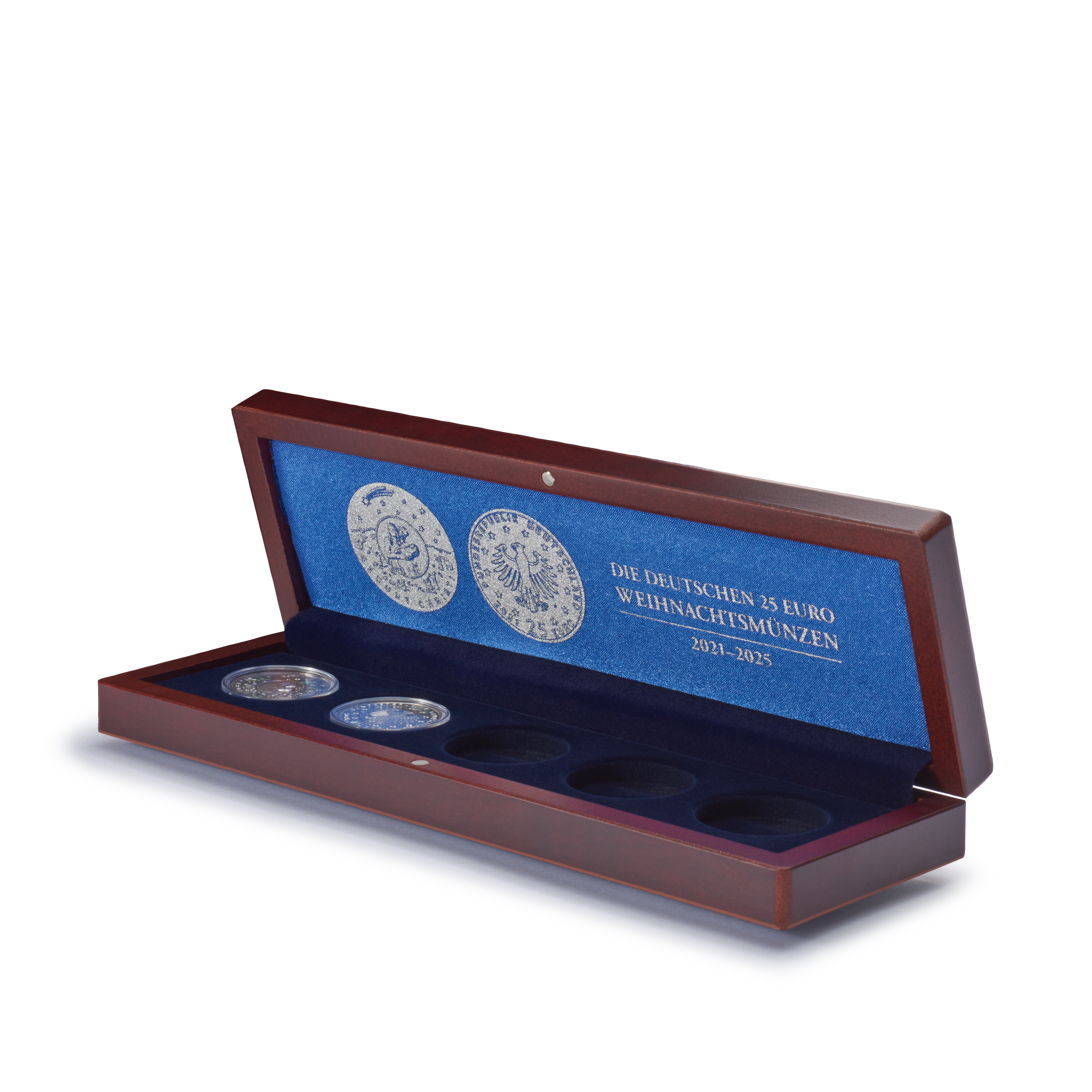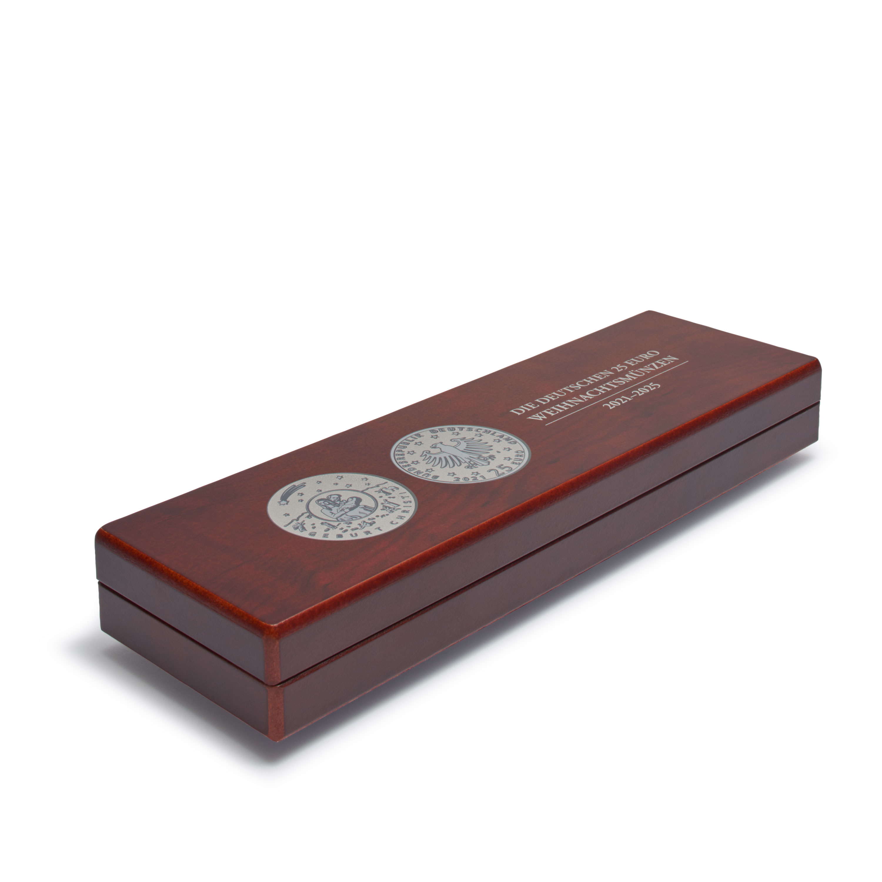 Hochwertiges Münzetui zur Unterbringung der 5 deutschen 25-Euro-Münzen „Weihnachten“ in Kapseln (Innendurchmesser 30 mm). Edle, mahagonifarbene Holzmaserung. Themenspezifischer Deckeldruck. Einlage mit veloursartiger Oberfläche. Mit Magnetverschluss. Kapseln nicht im Lieferumfang enthalten. Außenformat: 280 x 80 x 30 mm.