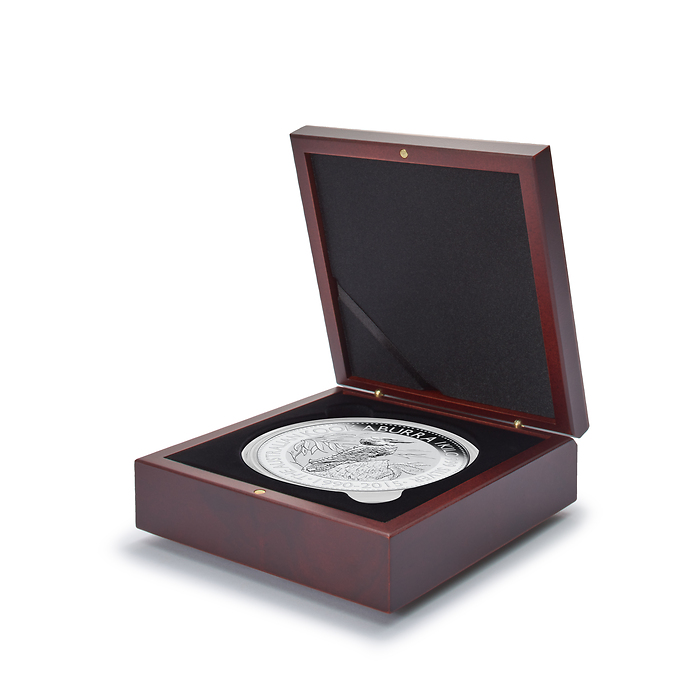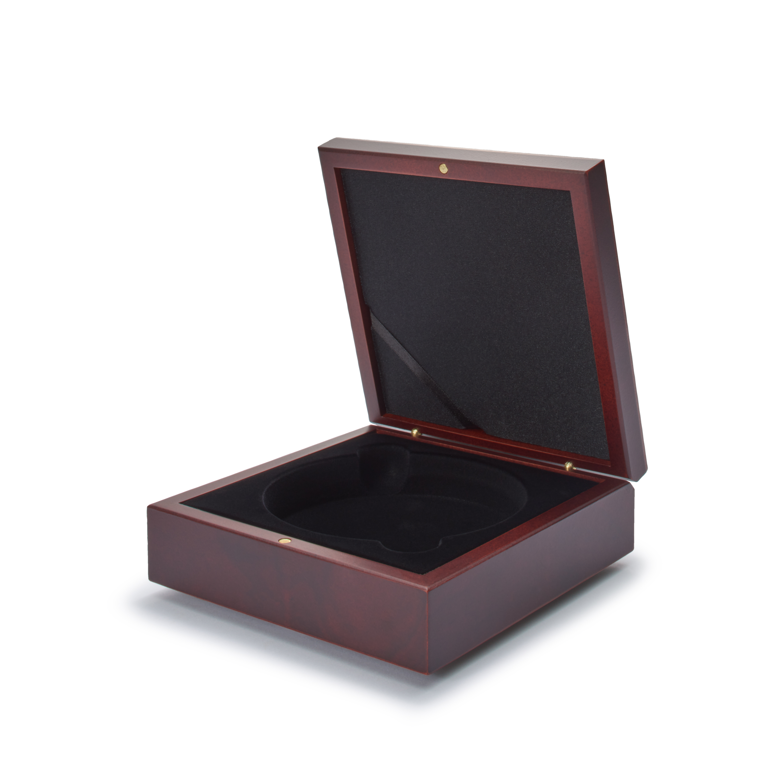 Münzetui VOLTERRA mit mahagonifarbener Holzmaserung für 1 Münzkapsel GRIPS XL 53–101. Deckelkissen mit schwarzem Satin gepolstert. Schwarze Velours-Einlage mit einer Vertiefung (Ø 111,5 mm). Inkl. Satinbändchen für Zertifikate. Z.B. für gängige 1 kg -Silber- Münzen wie Kookaburra, Koala, Panda, Somalia Elefant etc. geeignet. Außenformat: 150 x 150 mm.