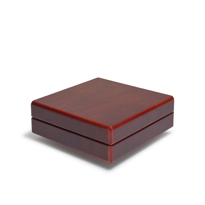 Hochwertiges Münzetui in mahagonifarbener Holzmaserung. Deckelkissen in dunkelblauer Seide, Bodenteil mit vorgeformten Vertiefungen und veloursartiger Oberfläche, für 1 Münze bis 60 mm Durchmesser. Außenmaß: 100 x 100 mm